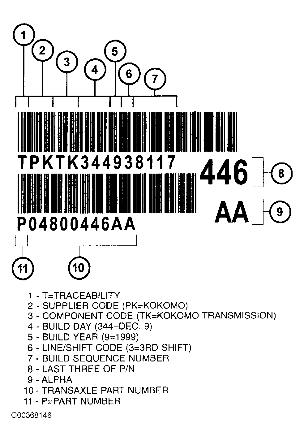 Depending on date of manufacture, some transaxles will utilize a new identification label located on transaxle identification label. This label can be broken down. See Fig 2 .
