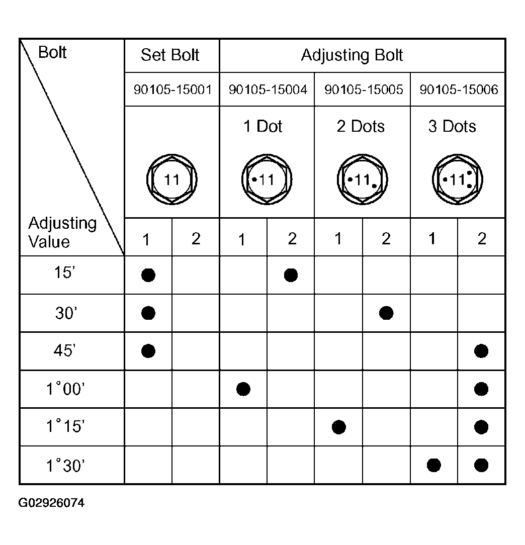 - Adjusting value for the set bolts is 6' - 30' (0.1° - 0.5°).