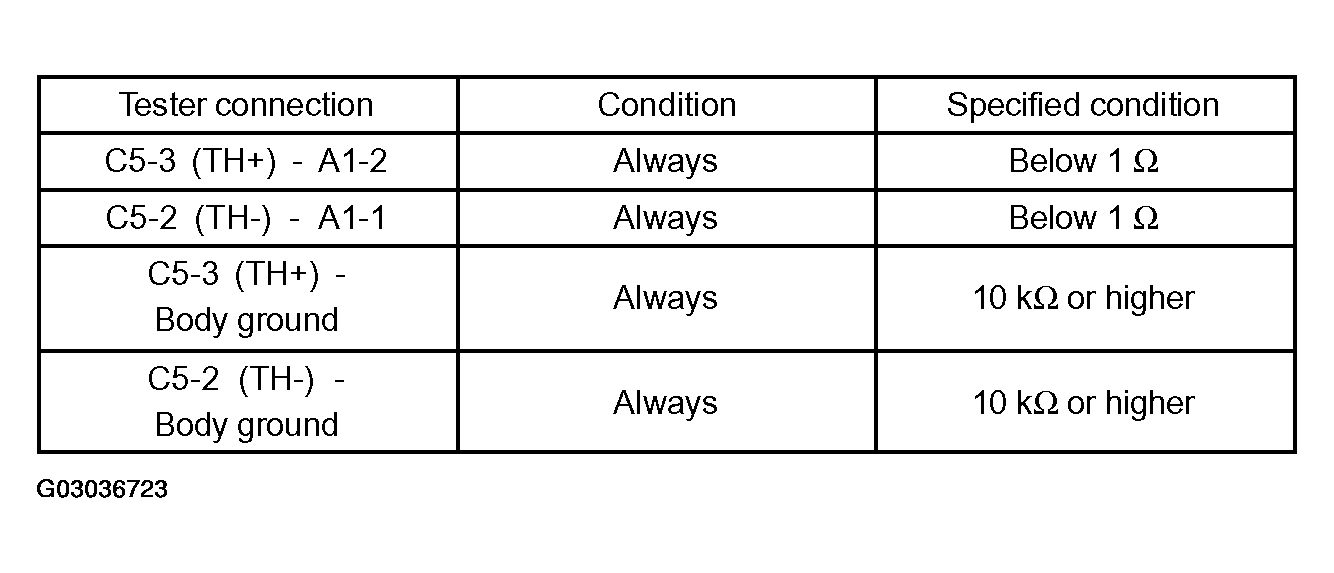 CLOCK ASSY (TH+ - SG) VOLTAGETester connection Condition Specified condition C5-3 (TH+) - C5-2 (SG) Ignition switch ON at 25°C (77°F) 1.8 to 2.2 V C5-3 (TH+) - C5-2 (SG) Ignition switch ON at 40°C (104°F) 1.2 to 1.6 V C5-13 (DATA) - Body ground Each temperature Pulse generation