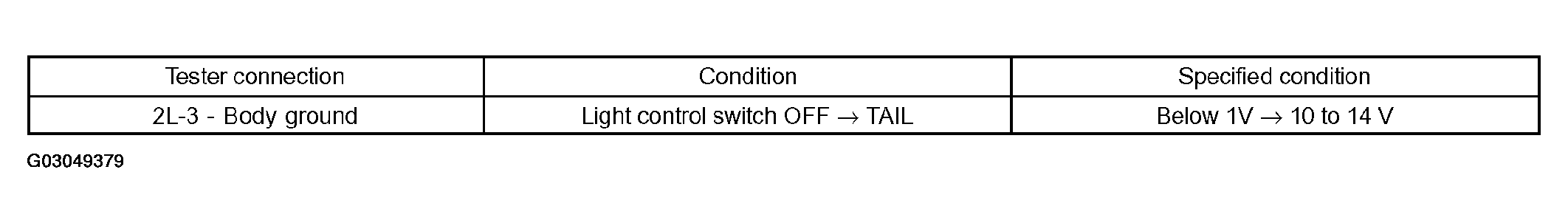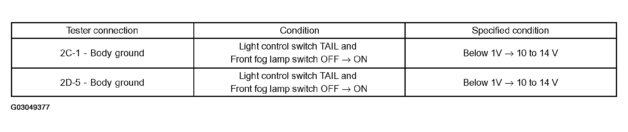 SPECIFIED CONDITIONTester connection Condition Specified condition 2A-1 - Body ground Always 10 to 14 V