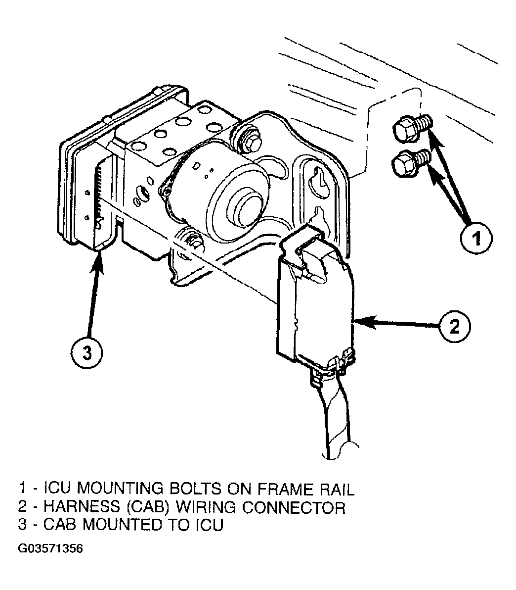 - Place ICU with mounting bracket over two mounting bolts in frame rail (Figure ). Tighten bolts to 24 N.m (18 ft. lbs.) torque.