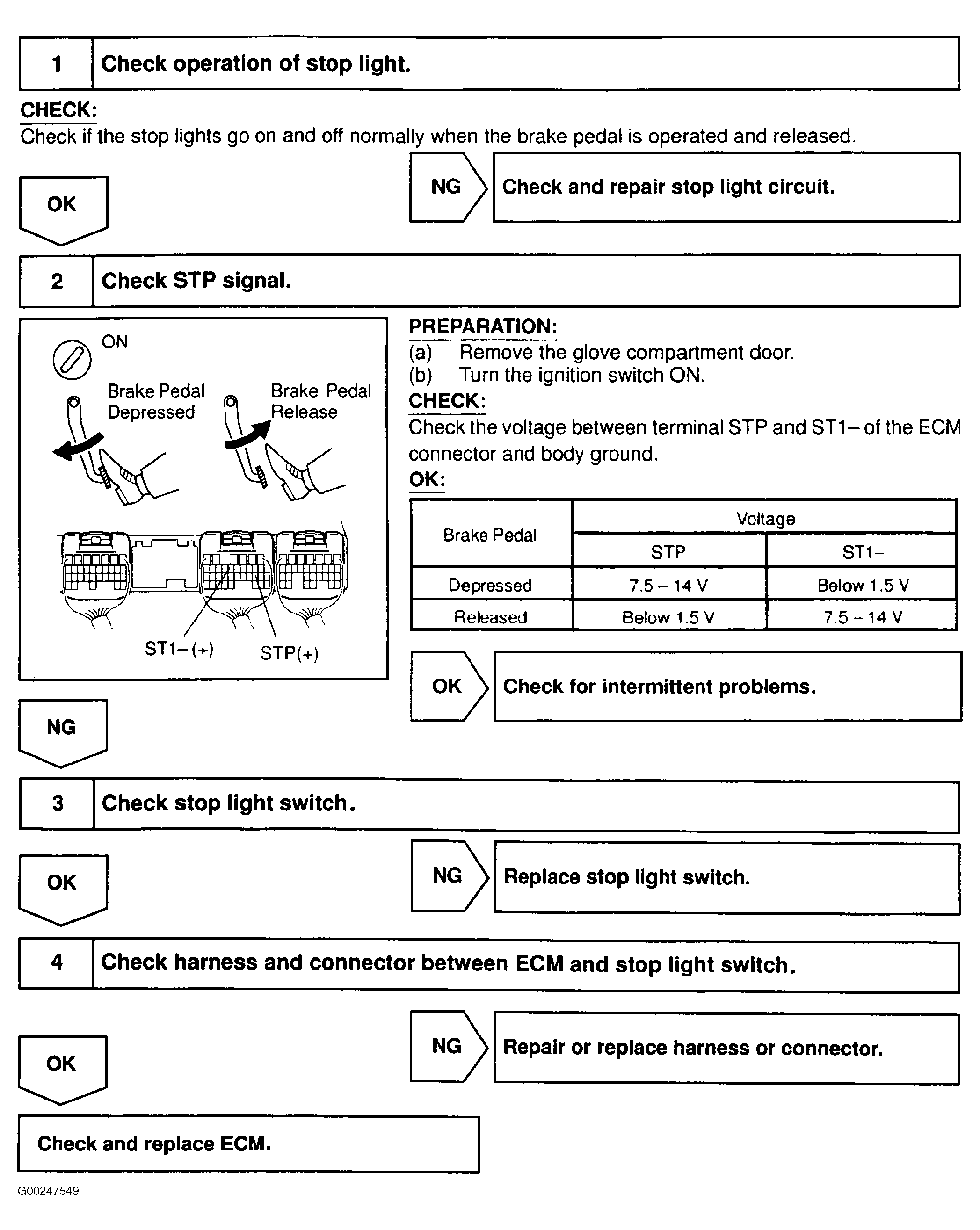 Home >> Toyota >> 2004 >> Matrix Base, FWD, Automatic >> Repair and Diagnosis (Single Page) >> External Pages >> Different car >> Section 129 (Engine Control System Self Diagnostics) >> Diagnostic Tests >> DTC P0504: Brake Switch "A"/"B" Correlation >> Diagnosis & Repair