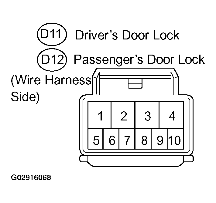 TESTING DOOR LOCK CONTINUITYTest Between Terminals No. Specified Condition D11-7 <--> Body Ground Continuity D12-8 <--> Body Ground Continuity - NG: REPAIR OR REPLACE WIRE HARNESS AND CONNECTOR
