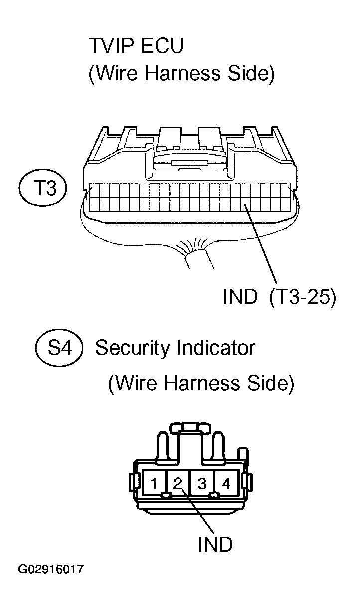 CHECKING TVIP ECU & SECURITY INDICATOR IND TERMINALS CONTINUITYTest Between Terminals No. Specified Condition IND (T3-25) <=> IND (S4-2) Continuity