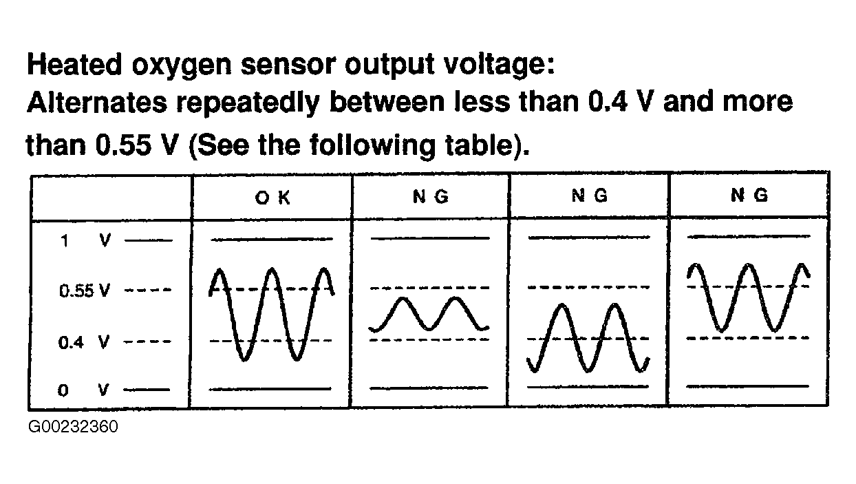 - Start engine and raise engine speed to 2500 RPM for about 90 seconds. Let engine idle. Using scan tool, monitor each heated oxygen sensor No. 1 output voltage. Voltage should alternate repeatedly between less than .4 volt and more than .55 volt. See Figure. If voltage is as specified, go to step 7. If voltage is not as specified, go to next step.