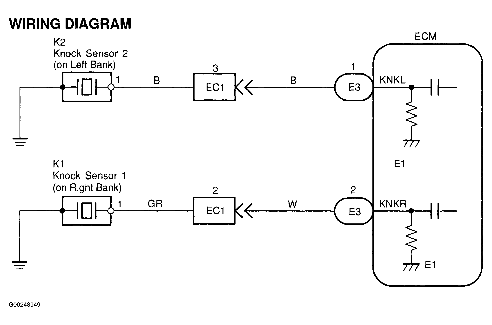 Each knock sensor is fitted to the right bank and left bank of the cylinder block to detect engine knocking. Sensor contains a piezoelectric element which generates a voltage when it becomes deformed, which occurs when cylinder block vibrates due to knocking. If engine knocking occurs, ignition timing is retarded to suppress it. If DTC is set, ECM will operate in fail-safe mode (maximum timing retardation). DTC is set when there is no knock sensor signal to ECM with engine speed of 1700-5400 RPM. DTC P0325 is for knock sensor No. 1 on left side of cylinder block. DTC P0330 is for knock sensor No. 2 on right side of cylinder block. See Fig 1. Possible causes are: