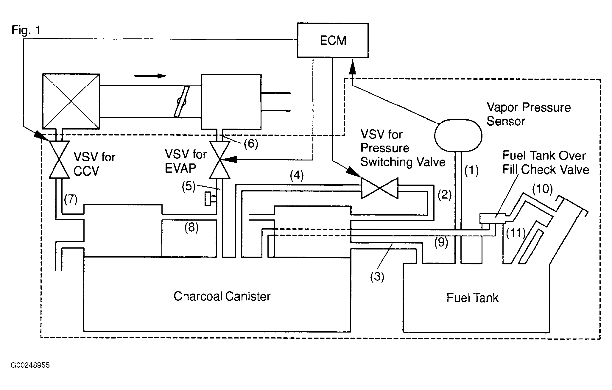 - Check vacuum hoses 8, 9, 10 and 11 in illustration. See Figure. Repair as necessary. If okay, go to next step.
