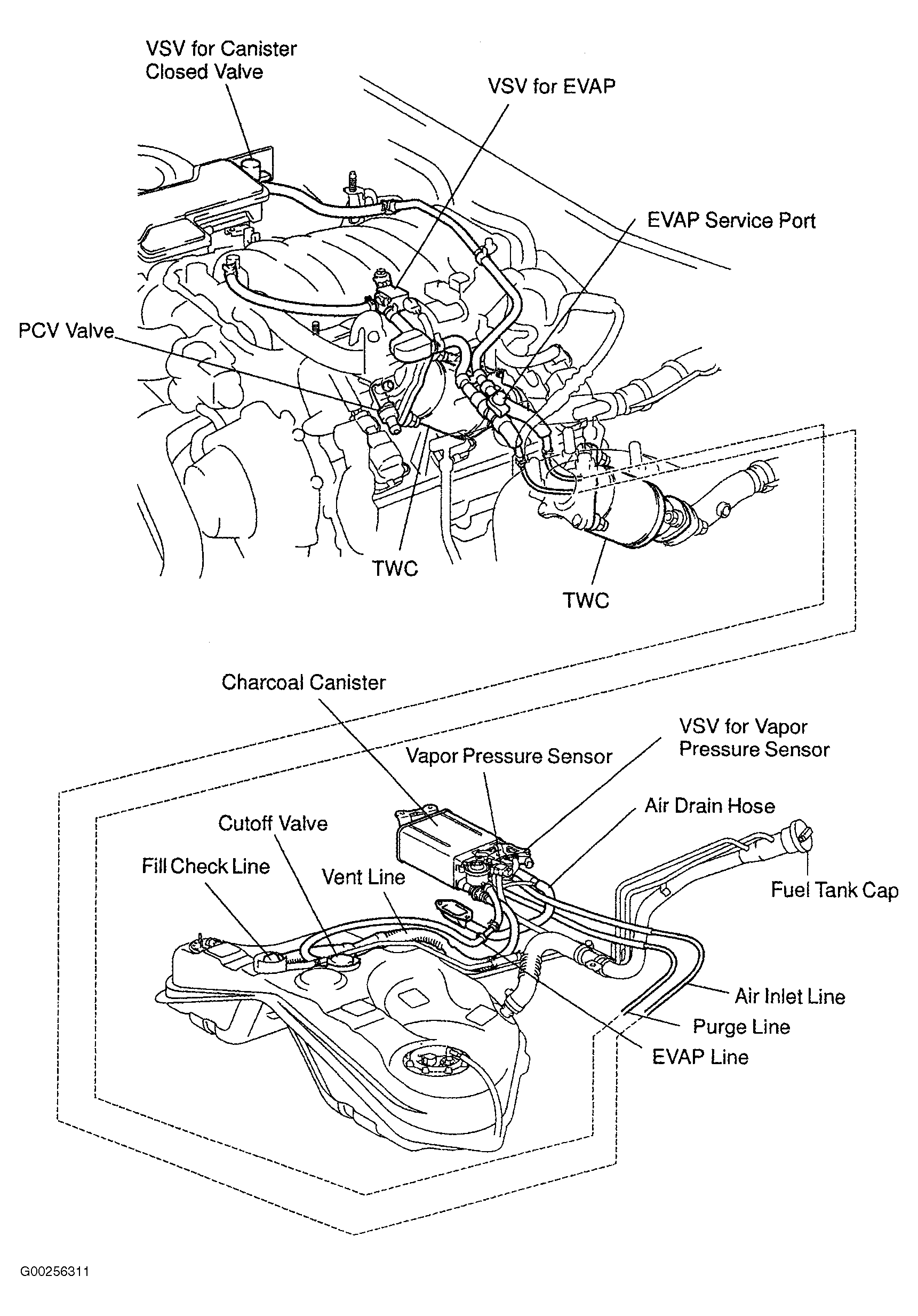 - Check operation of VSV for EVAP. See step 8 under DIAGNOSIS & REPAIR (USING HAND-HELD TESTER). If okay, go to next step. If not okay, replace VSV and clean vacuum hoses between throttle body and VSV for EVAP, and VSV for EVAP and charcoal canister, and then check charcoal canister.
