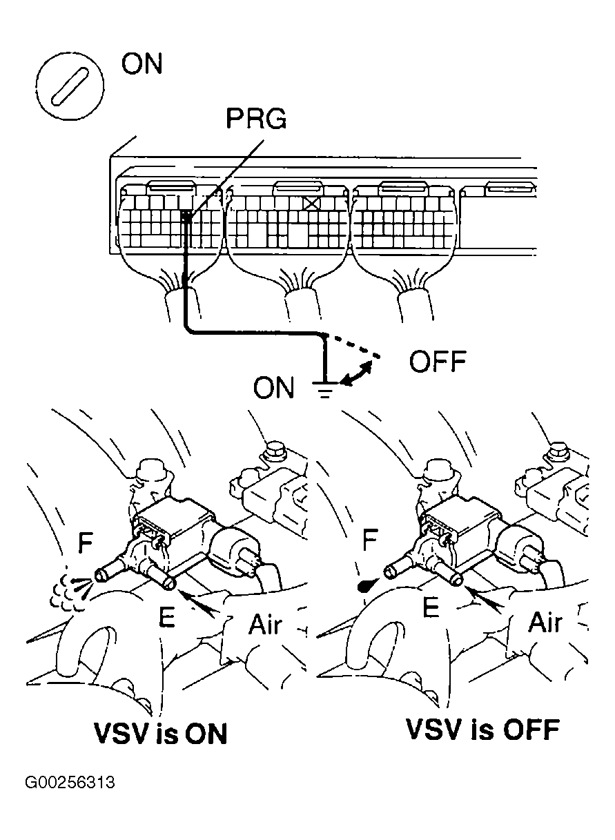 - Check the VSV function by connecting jumper wire between terminal PRG of the ECM connector E2 and body ground, then disconnect wire. When VSV is ON, air from port "E" flows out through port "F". When VSV is OFF, air does not flow from port "E" to port "F". See Fig 1. If okay, go to step 16. If not okay, go to next step.