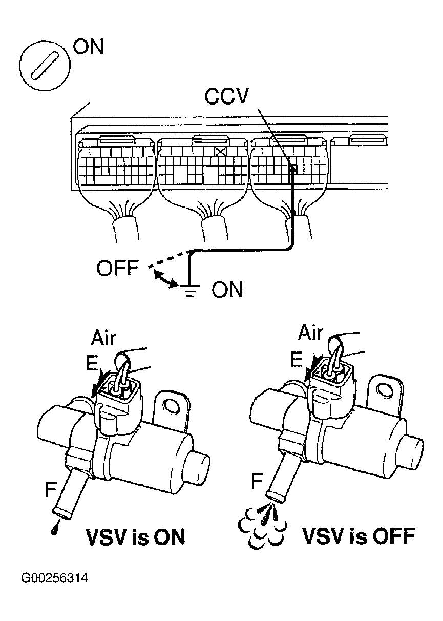- Check the VSV function by connecting jumper wire between terminal CCV of the ECM connector E4 and body ground, then disconnecting wire. When VSV is ON, air does not flow from port "E" to port "F". When VSV is OFF, air from port "E" flows out through port "F". See Fig 2. If okay, go to step 19. If not okay, go to next step.