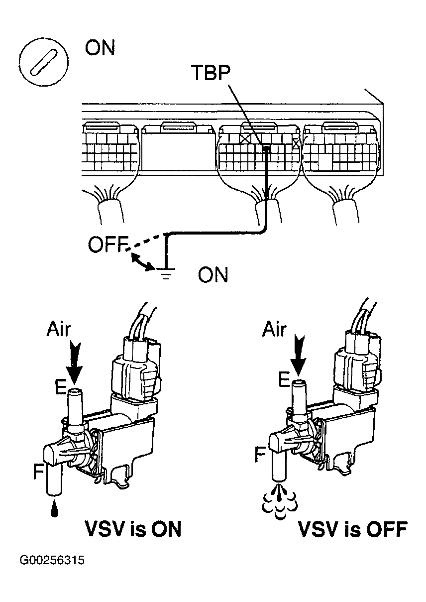 - Check VSV function. Connect jumper wire between terminal TBP of ECM connector E5 and body ground, then disconnect wire. When VSV is ON, air from port "E" flows out through port "F". When VSV is OFF, air does not flow from port "E" to port "F". See Fig 3. If okay, go to step 22. If not okay, go to next step.