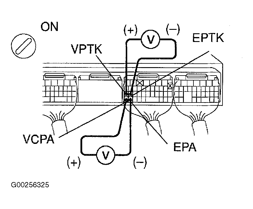 - Remove engine room ECM cover. Turn the ignition switch ON. Measure voltage between terminals VCPA and EPA, VPTK and EPTK of ECM connector E5. See Figure. If voltage is 4.5-5.5 volts, go to next step. If voltage is not 4.5-5.5 volts, replace ECM.