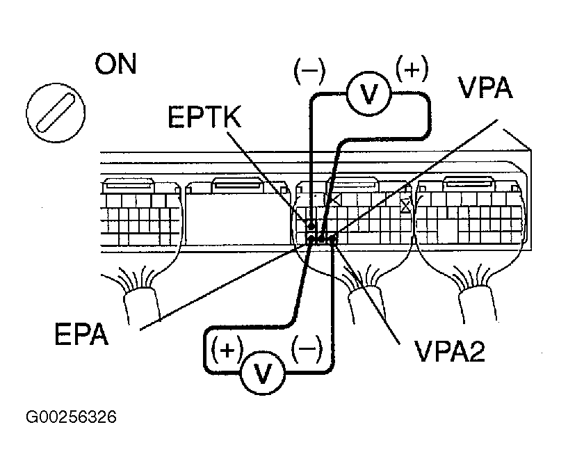 - Measure voltage between terminals VPA and EPTK, and VPA2 and EPA of ECM connector E5. See Figure. With pedal released, VPA voltage should be .5-1.1 volts and VPA2 voltage should be .9-2.3 volts. With pedal depressed, VPA voltage should be 3.0-4.6 volts and VPA2 voltage should be 3.4-5.0 volts. If okay, replace ECM. If not okay, go to next step.