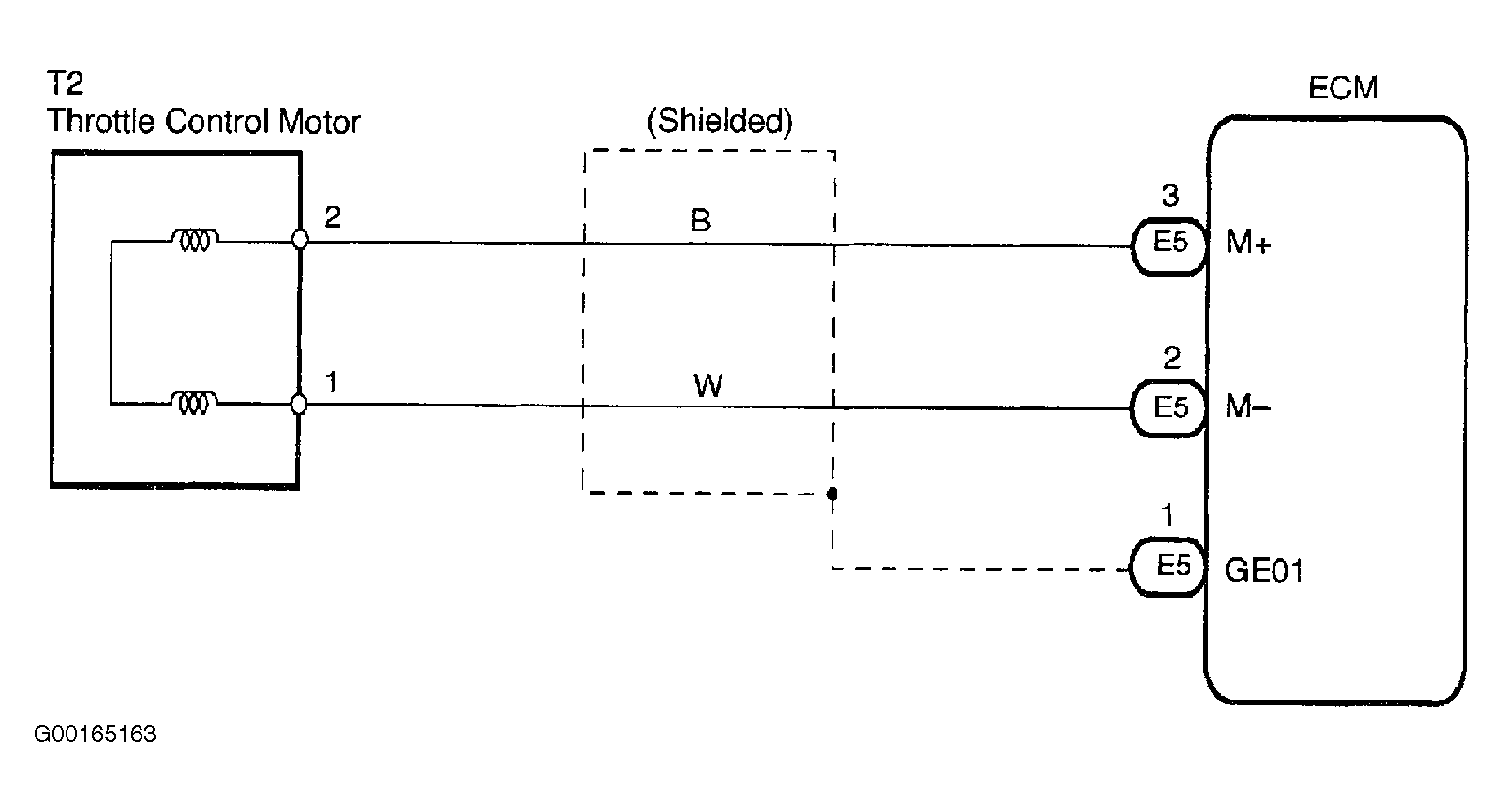 Throttle motor is operated by the ECM and it opens and closes the throttle valve. The opening angle of the throttle valve is detected by the throttle position sensor which is mounted on the throttle body. It provides feedback to the ECM to control the throttle motor in order to adjust the throttle valve opening angle properly in response to driving condition. If either DTC is stored, the ECM shuts down the power for the throttle motor, and throttle valve is fully closed by the return spring. DTC detection condition is when throttle control motor output duty is greater than 80 percent and current is less than .5 amps for 2 seconds, throttle control motor circuit is greater than 10 amps, or throttle control motor current is greater than 7 amps for more than .6 seconds. See Fig 1. Possible causes are: