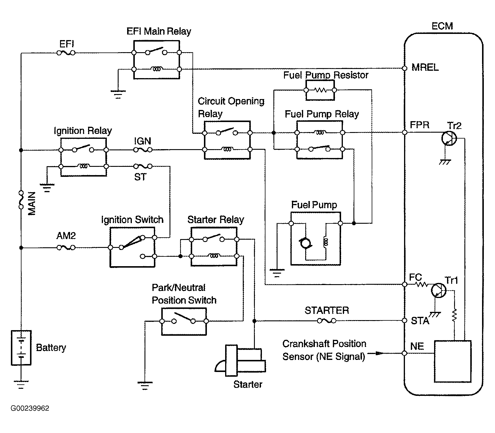 When engine is cranked, current flows from terminal ST of the ignition switch to the starter relay coil and also current flows to terminal STA of the ECM (STA signal). See Fig 1 and Fig 2 . When the STA signal and NE signal are input to the ECM, the Tr1 is turned ON, current flows to the coil of the circuit opening relay, the relay switches on, power is supplied to the fuel pump, and the fuel pump operates. While the NE signal is generated (engine running), the ECM keeps the Tr1 ON (circuit opening relay ON) and the fuel pump also keeps operating. The fuel pump speed is controlled at 2 levels (high speed or low speed) by the condition of the engine (starting, light load, heavy load). When the engine starts (STA ON), the Tr2 in the ECM is OFF, so the fuel pump relay closes and battery positive voltage is applied directly to the fuel pump. The fuel pump operates at high speed. After the engine starts during idling or light loads, since the Tr2 goes ON, power is supplied to the fuel pump via the fuel pump resistor. The fuel pump operates at low speed. DTC is set when there is an open or short in fuel pump relay circuit. Possible causes are: