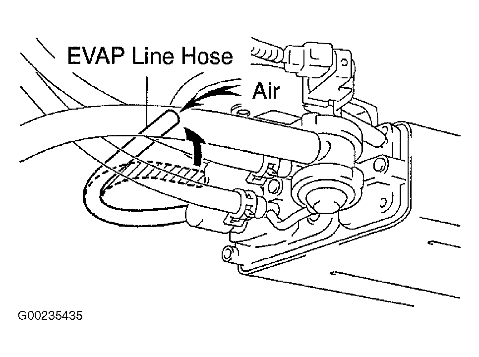Disconnect EVAP line hose from charcoal canister side and pressurize fuel tank to .58 PSI (4 kPa). See Fig 1. Check that internal pressure of fuel tank holds for one minute. If pressure does not hold, check connected portions of each hose and pipe. Check installed parts on fuel tank. If connections and parts are normal, replace fuel tank and filler pipe. Reconnect EVAP line hose to charcoal canister.