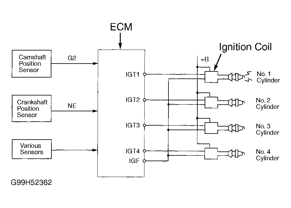 ECM uses 4 ignition primary control signals to ignitors for ignition coils. DIS uses 4 ignition coils with internal ignitors, one ignition coil for each cylinder. See Figure. Cylinder No. 1 is front cylinder at timing chain end of engine and cylinder No. 4 is rear cylinder at flywheel end of engine. ECM monitors IGF circuit at ignitor to ensure ignition coils have fired.