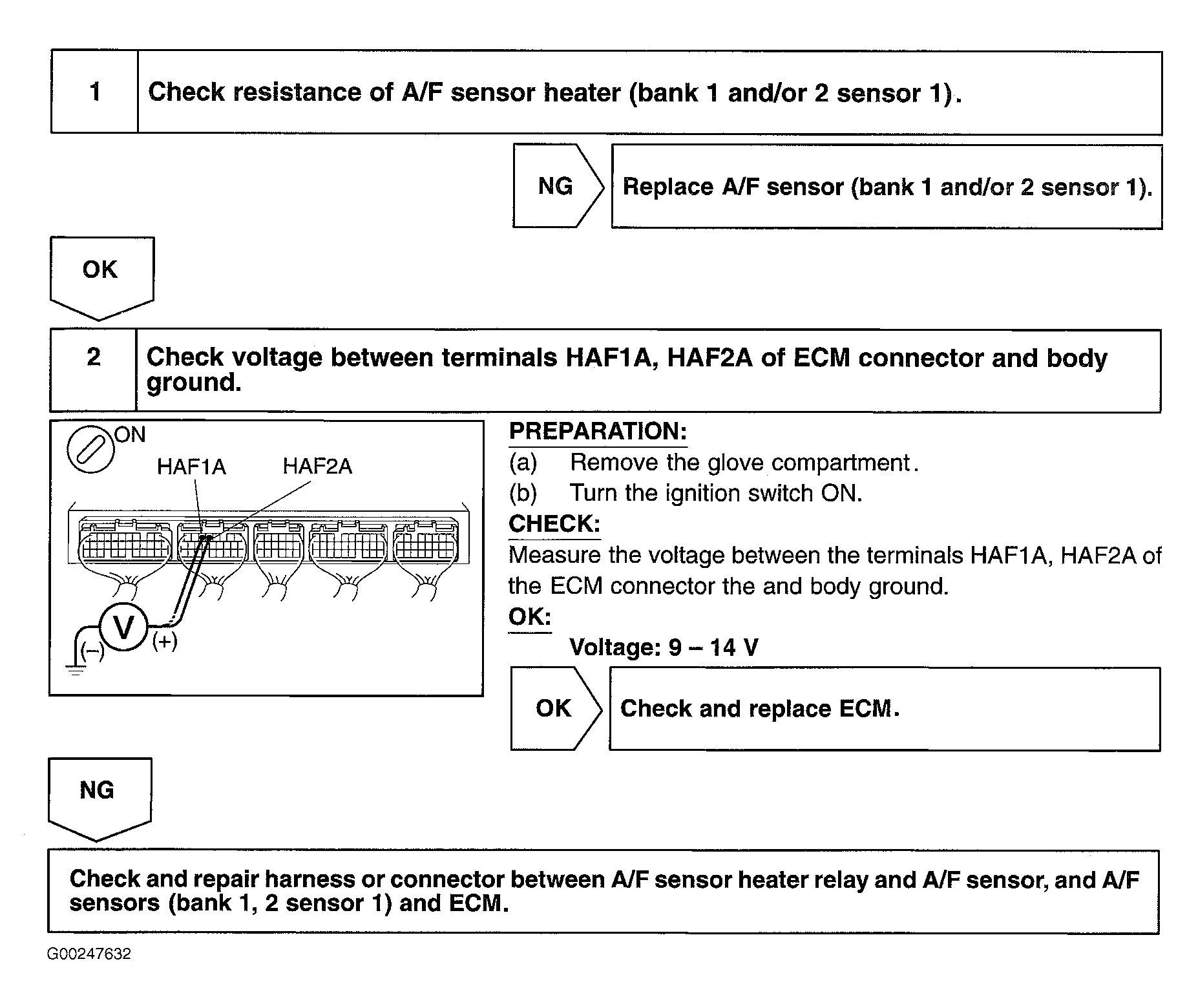 For diagnosis and repair procedure, see Fig 1. For A/F sensor circuit wiring diagram, see Figure. To check heater resistance on A/F sensor, see Figure.