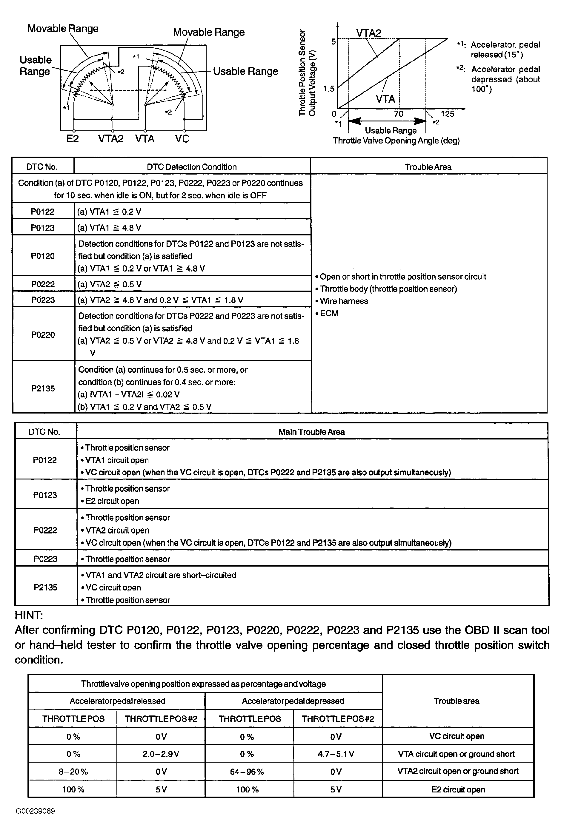 For DTCs P0120, P0122, P0123, P0220, P0222, P0223 & P2135 detection conditions and possible causes, see Fig 1