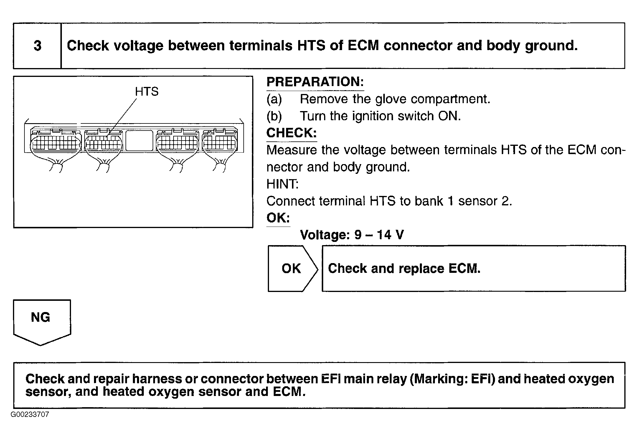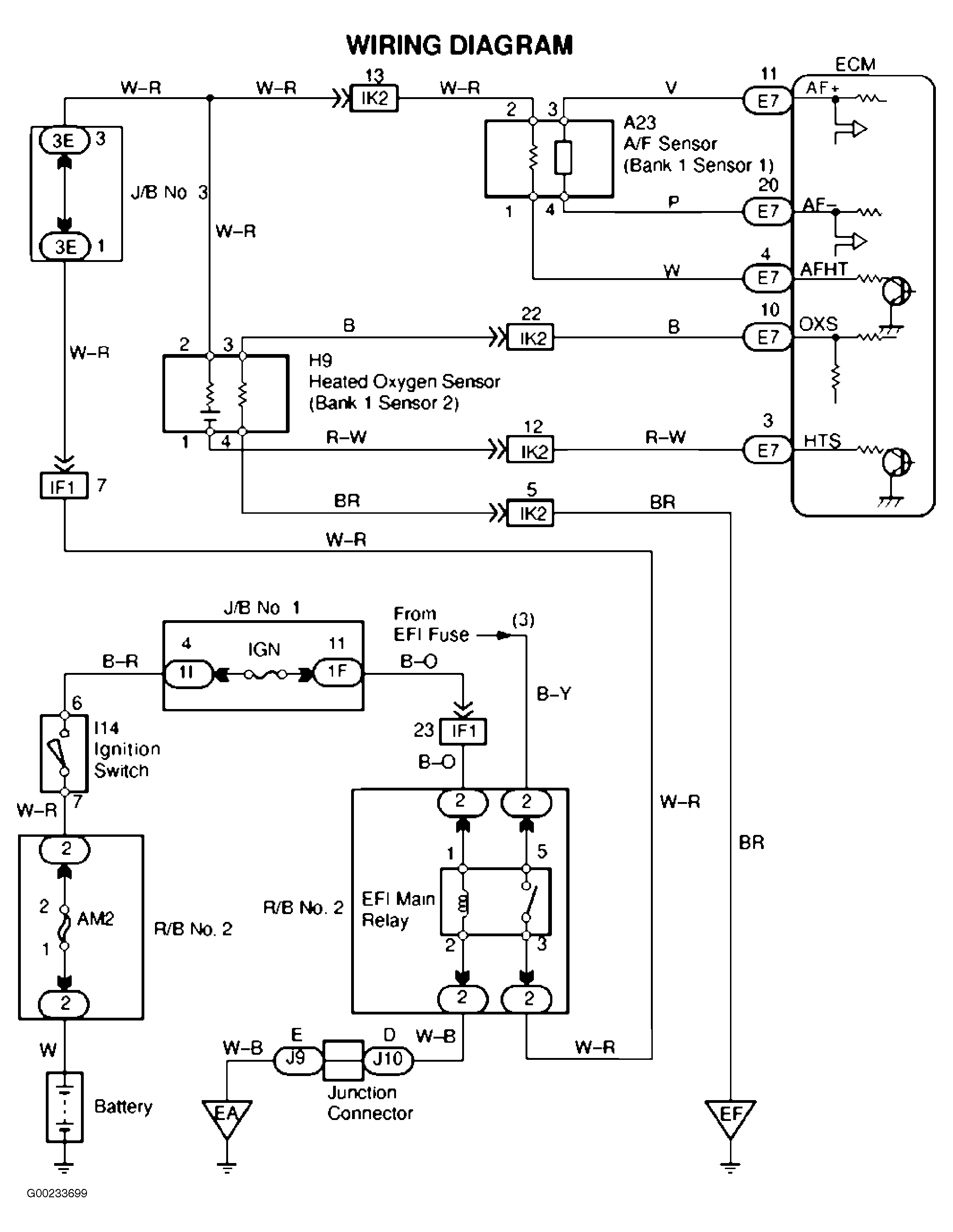 For A/F sensor circuit wiring diagram, see Figure. When access to, or replacement of ECM is necessary, Engine Control Module (ECM) is located behind glove box. See Figure. For ECM connector terminal view, see Figure. For testing of systems or components, see SYSTEM & COMPONENT TESTING - 4-CYLINDER article. For removal and installation of components, see REMOVAL, OVERHAUL & INSTALLATION - 4-CYLINDER article.