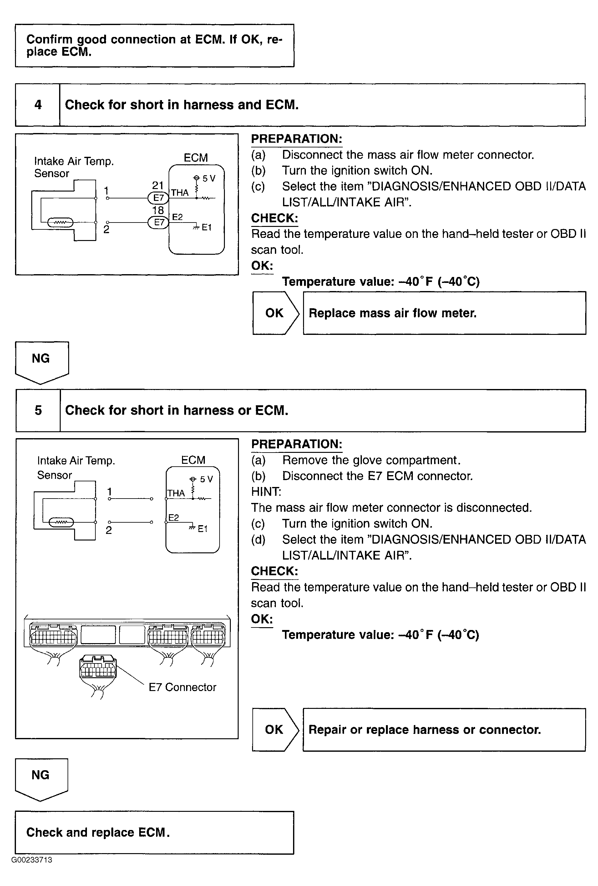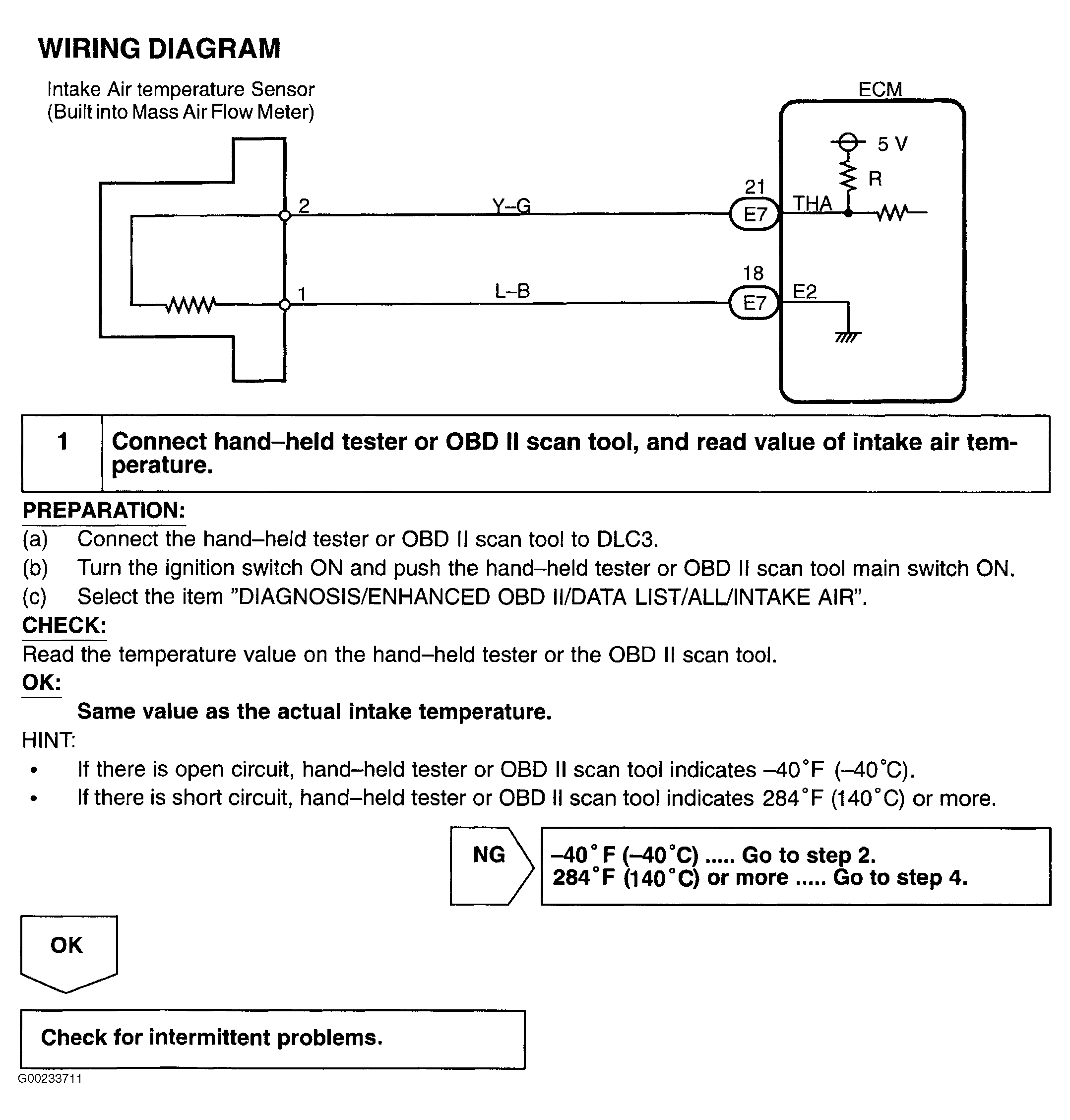Using hand-held tester or scan tool, read FREEZE FRAME data. Freeze frame data records engine conditions when malfunction is detected. After confirming DTC P0110, use Toyota hand-held tester or scan tool to access CURRENT DATA to read the intake air temperature for IAT sensor. If displayed intake air temperature is -40°F (-40°C), IAT sensor circuit may be open. If displayed intake air temperature is 284°F (140°C) or more, IAT sensor circuit may be shorted.
