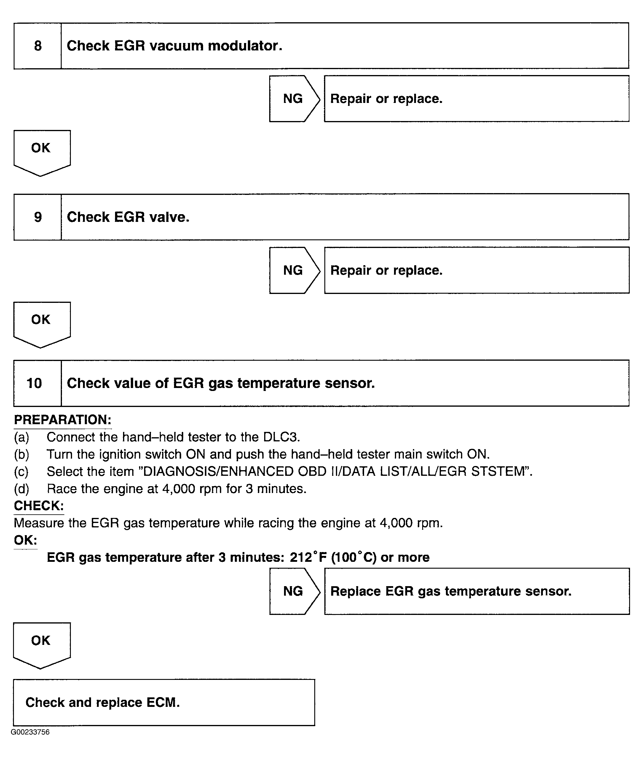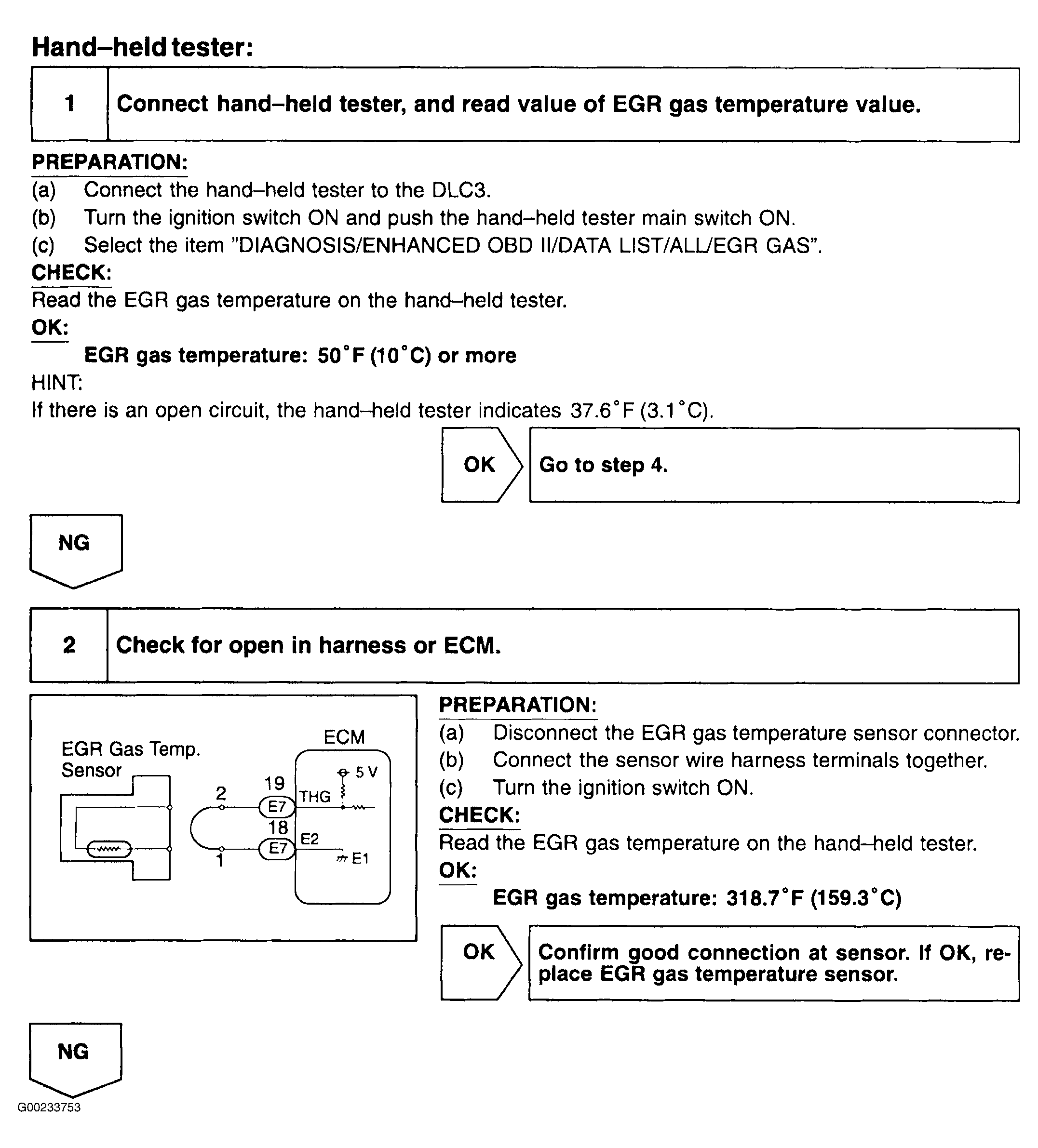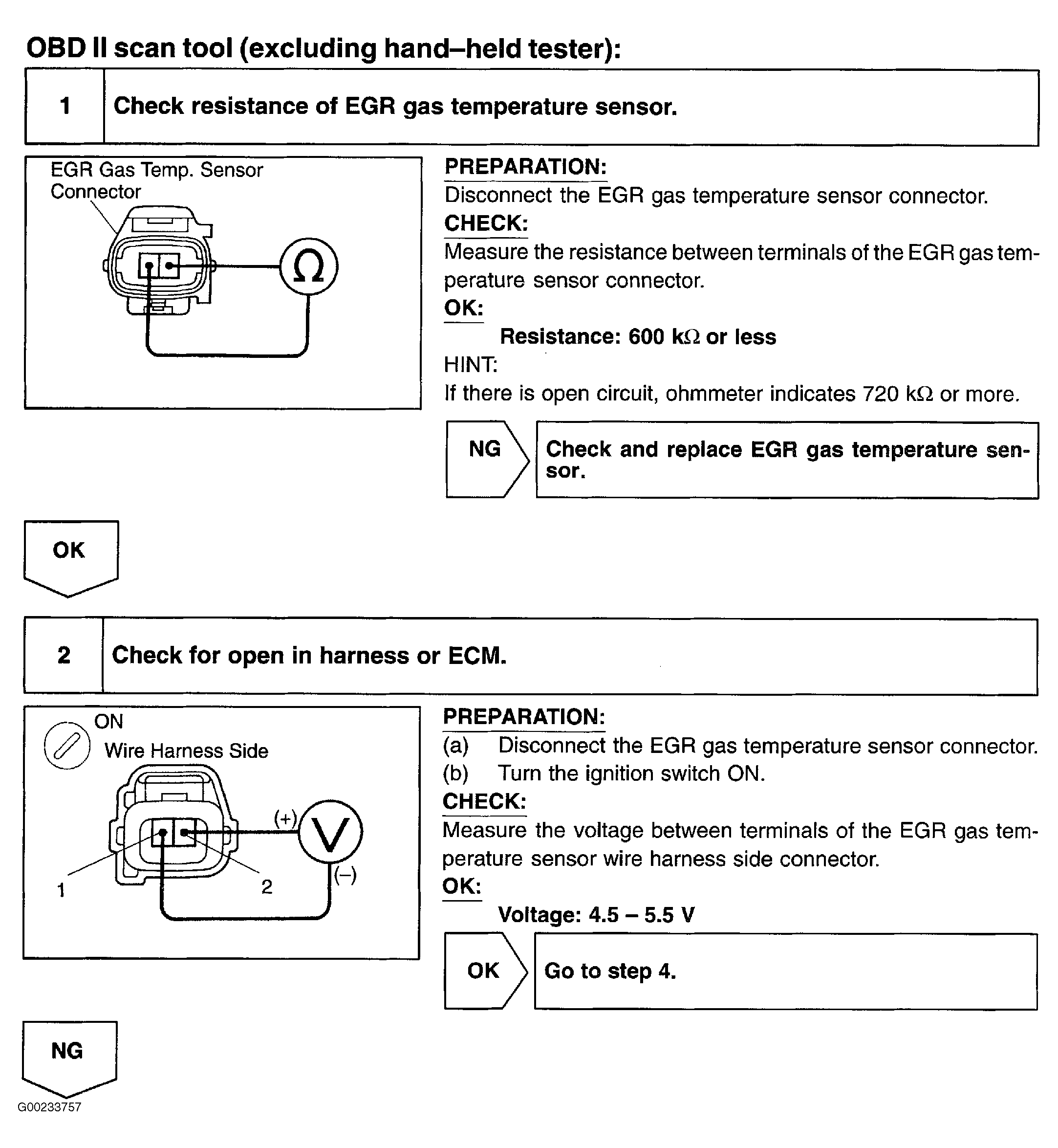 For diagnosis and repair procedure using Toyota Hand-held tester, see Fig 2-Fig 5 . For diagnosis and repair procedure using OBD II scan tool, see Fig 6-Fig 9 .
