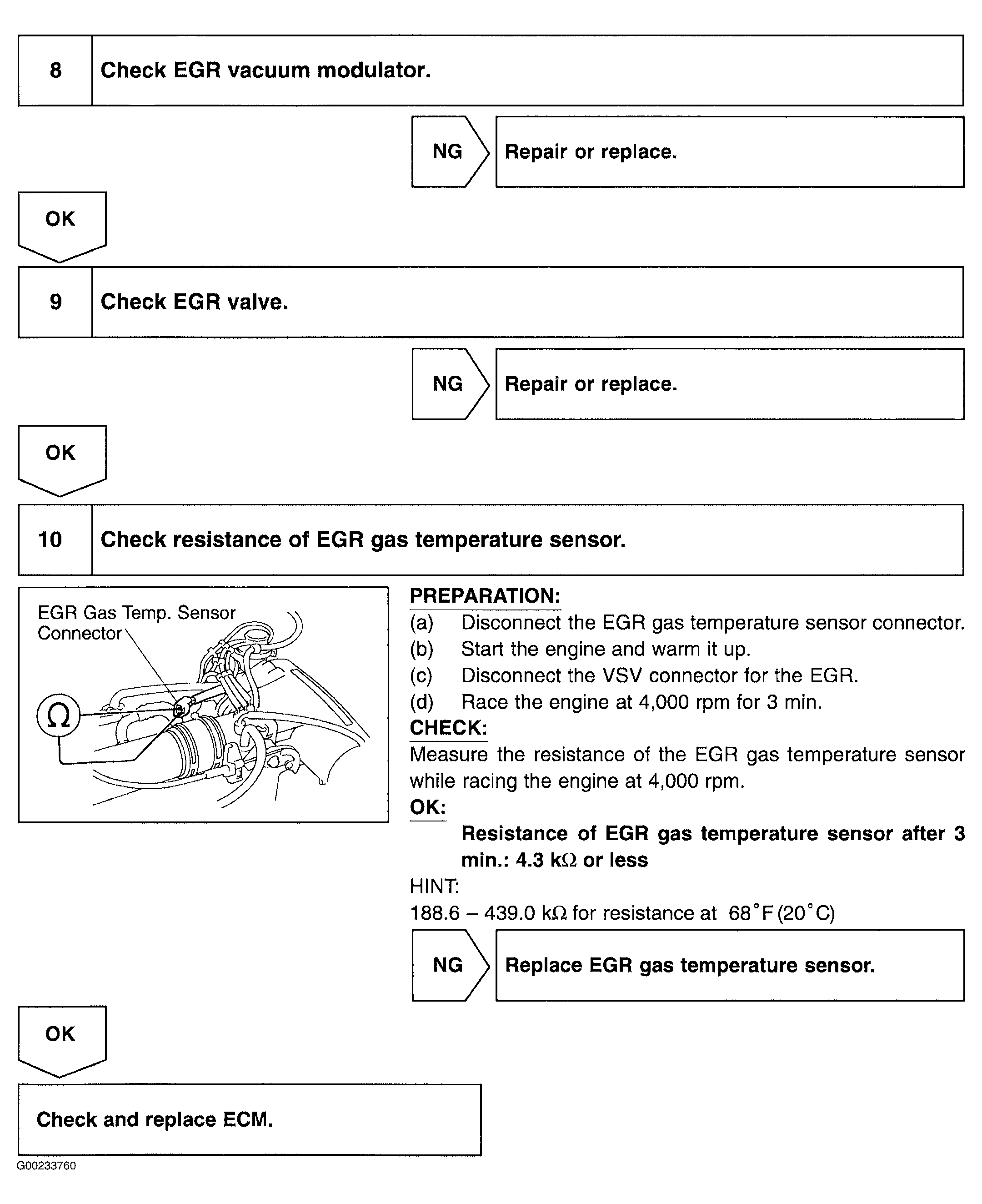 For EGR system wiring diagram, see Fig 1. EGR gas temperature sensor is located near EGR valve and contains Dark Gray 2-pin connector with Pink/Blue and Blue/Black wires. To locate EGR gas temperature sensor, see Fig 10. EGR VSV is located on bracket, near throttle body and contains Green 2-pin connector with White/Red and Red/Black wires. See Fig 11. When access to, or replacement of ECM is necessary, Engine Control Module (ECM) is located behind glove box. See Figure. For ECM connector terminal view, see Figure. For vacuum or EVAP hose routing, see VACUUM DIAGRAMS article. For testing of systems or components, see SYSTEM & COMPONENT TESTING - 4-CYLINDER article. For removal and installation of components, see REMOVAL, OVERHAUL & INSTALLATION - 4-CYLINDER article.