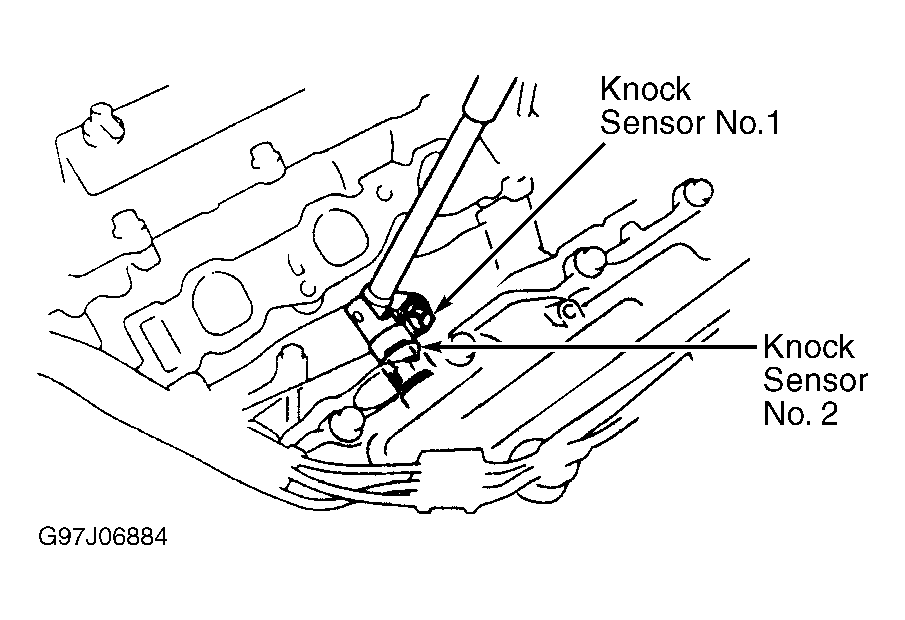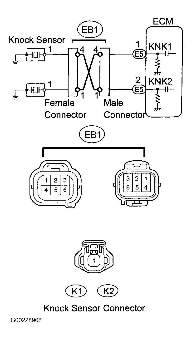 - If DTC P0325 has changed to P0330, check the knock sensor circuit on the left bank side. If DTC P0330 has changed to P0325, check the knock sensor circuit on the right bank side. Disconnect the EB1 6-pin connector. Disconnect the K1 and K2 knock sensor 1-pin connectors located below intake manifold on cylinder block. See Fig 3. Check the continuity between EB1 connector terminal No. 1 and K1 connector or between EB1 connector terminal No. 4 and K2 connector. See Fig 2. Continuity should exist. Check that continuity does not exist between either wire in harness and body ground. If continuity is not as specified, repair or replace wires and/or connectors as necessary. If continuity is as specified, replace suspect knock sensor. See KNOCK SENSOR