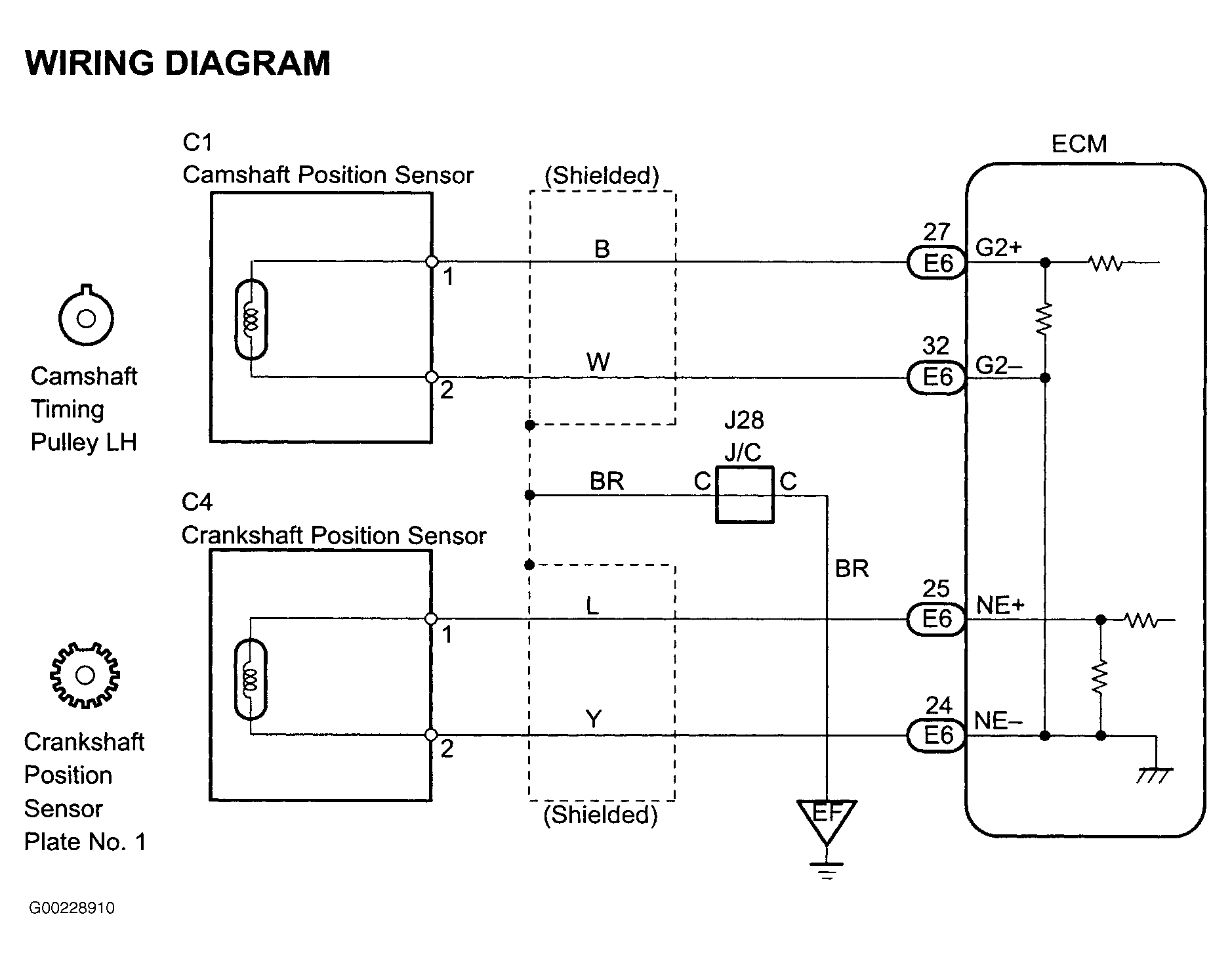 - Remove glove box to gain access to ECM connectors with ECM attached. See Figure. Check continuity between crankshaft position sensor 2-pin connector terminal No. 1 and ECM 32-pin connector E6 terminal No. 25 (NE+) (Blue wire). See Figure, Fig 1 & Fig 2 . Then, check continuity between crankshaft position sensor 2-pin connector terminal No. 2 and ECM 32-pin connector E6 terminals No. 24 (NE-) (Yellow wire). Continuity should exist. Check that continuity does not exist between ground and either wire. If continuity is as specified, go to next step. If continuity is not as specified, repair or replace wires and/or connectors as necessary.