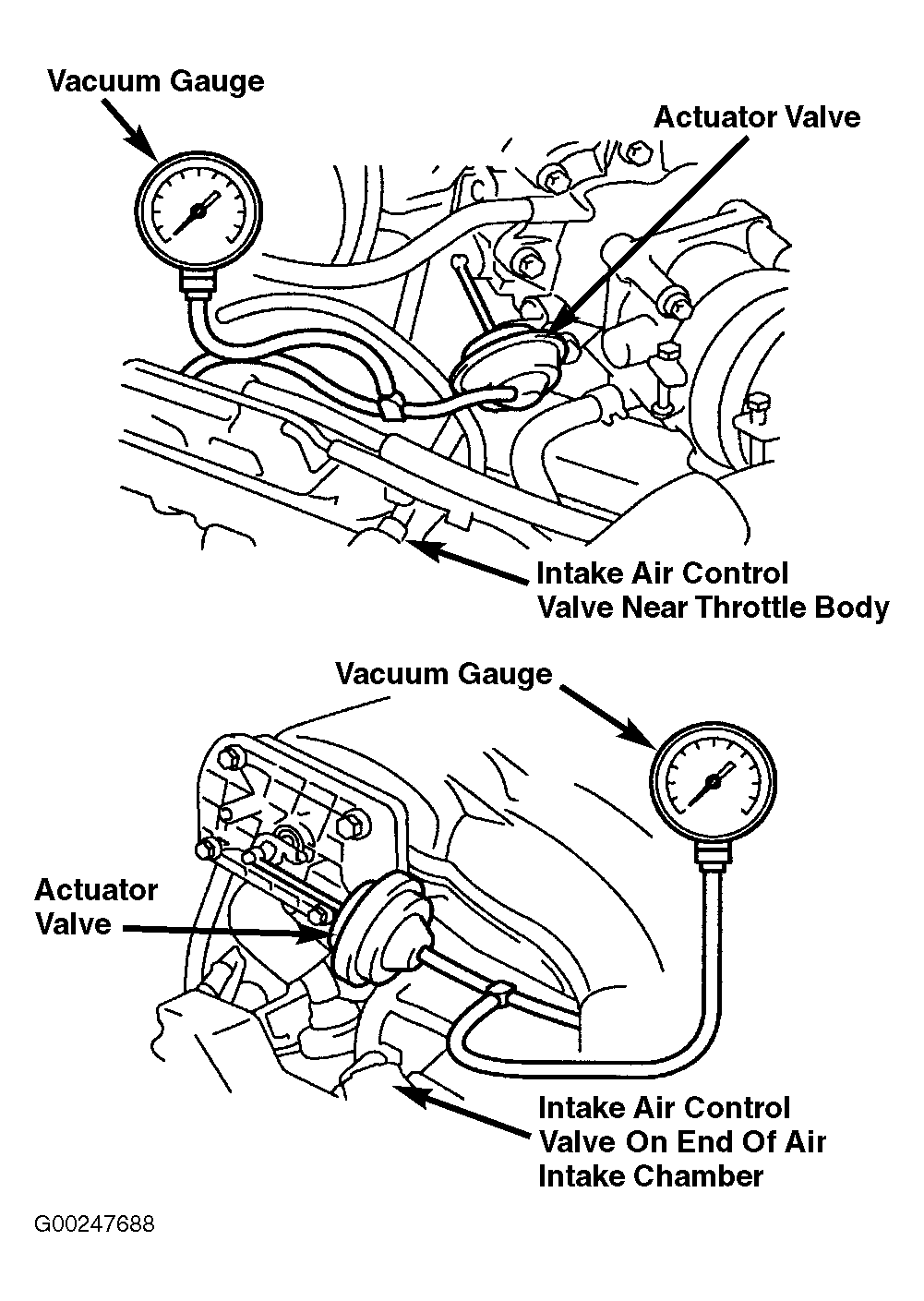 - Disconnect vacuum hose from actuator valve. Using vacuum pump, apply 7.9 in. Hg of vacuum to actuator valve. Ensure actuator valve closes and remains closed for at least one minute. If actuator valve operates properly, reconnect vacuum hose and go to next step. If actuator valve does not operate properly, replace intake air control valve assembly. See INTAKE AIR CONTROL VALVE under AIR INDUCTION SYSTEMS in REMOVAL & INSTALLATION - V6 & V8 article.