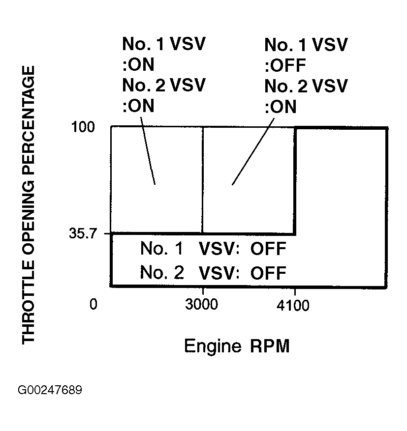 - Ensure transaxle is in park. While operating accelerator pedal, monitor data monitor on hand-held tester and check open and closed status of No. 1 and No. 2 intake air control valves in relation to throttle opening percentage and engine RPM. See Fig 2. Value in illustration is only for reference, as throttle valve open position varies by engine speed. Remove hand-held tester and reconnect vacuum hose. If system operates properly, test is complete. If system does not operate as specified, check ACIS control circuit. See ACOUSTIC CONTROL INDUCTION SYSTEM CONTROL CIRCUIT under COMPUTERIZED ENGINE CONTROLS.