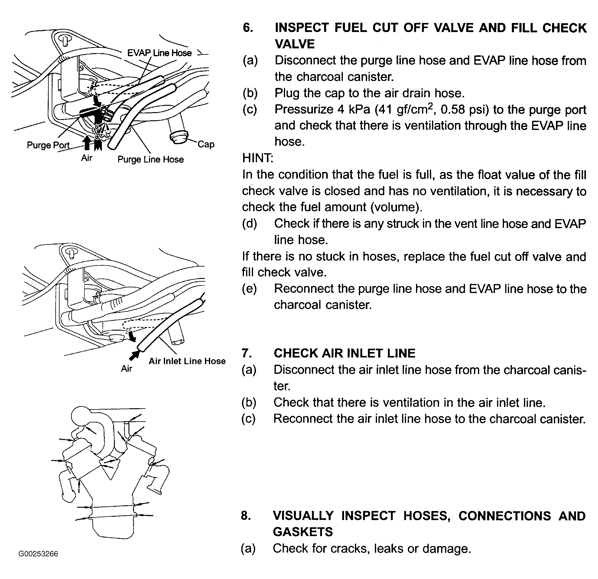Manufacturer provides testing information for testing airtightness of fuel tank and testing fuel EVAP system.