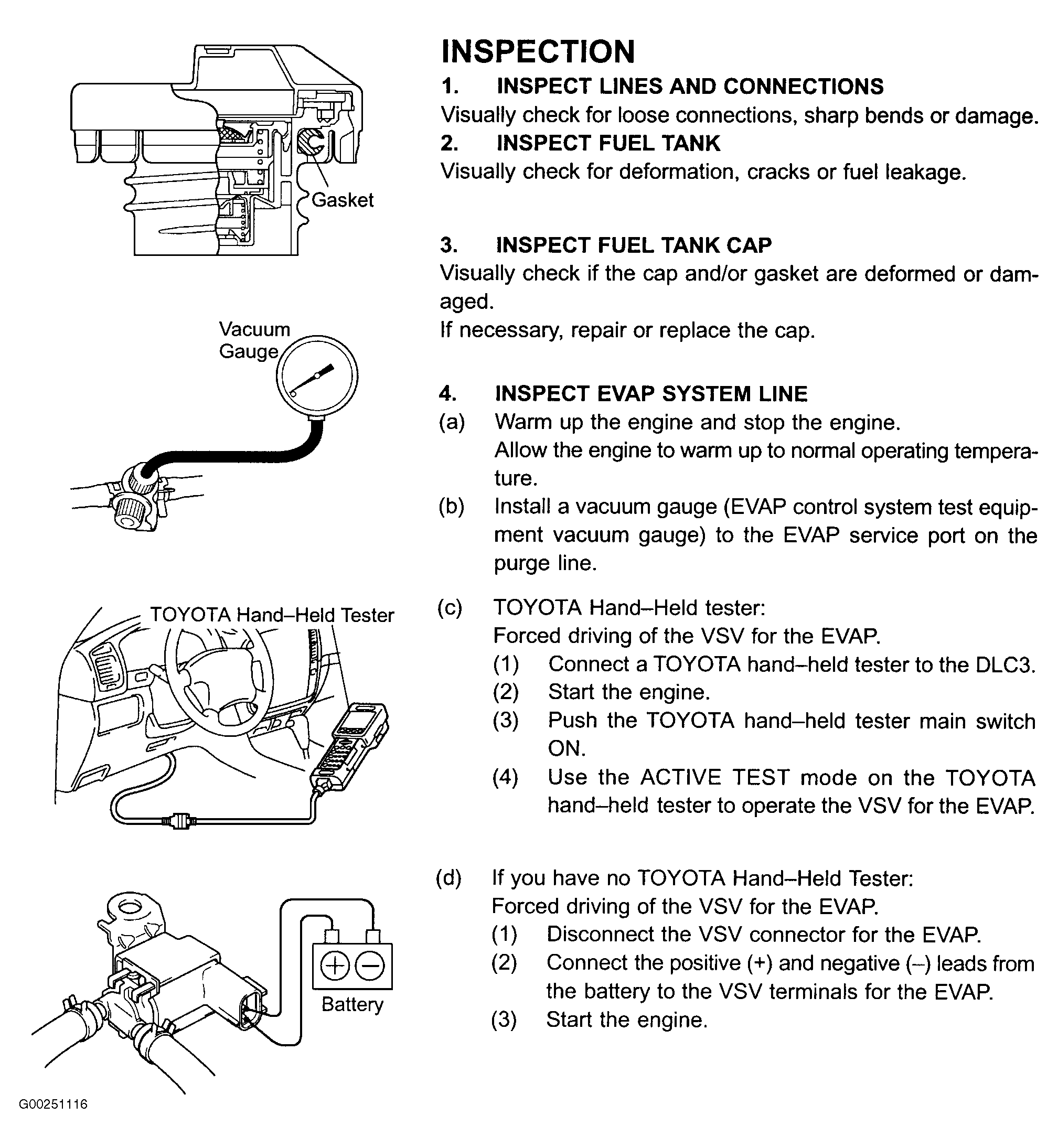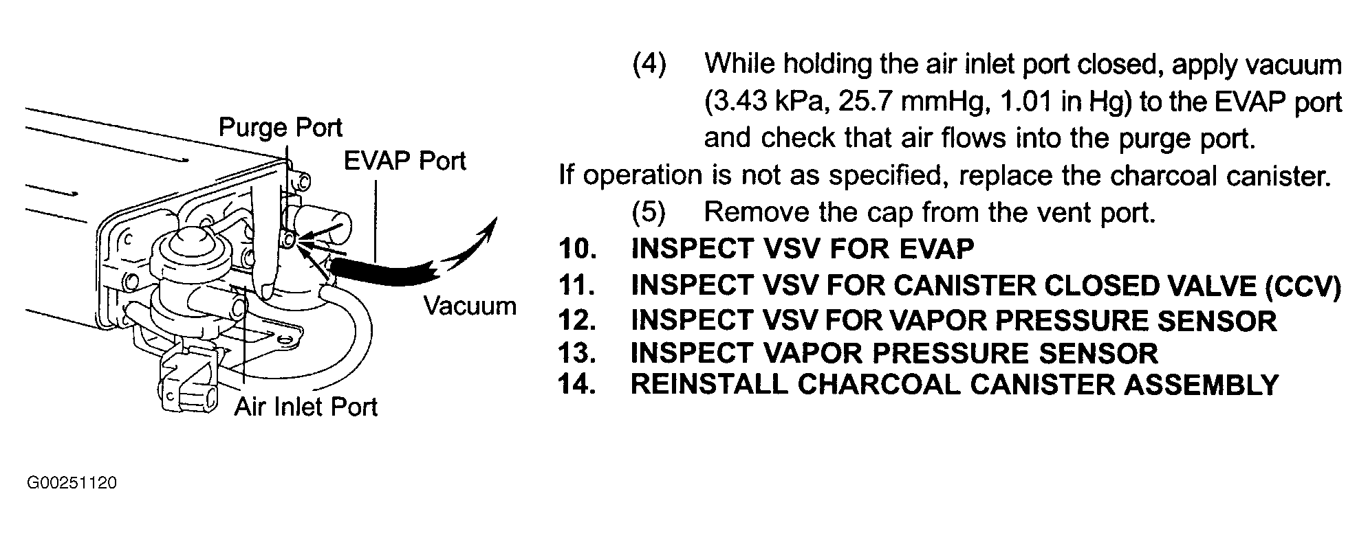 For fuel EVAP system test, see Fig 1 - Fig 5 . To inspect VSV for EVAP, see EVAP VACUUM SWITCHING VALVE (ALL MODELS) . To inspect VSV for Canister Closed Valve, see CANISTER CLOSED VALVE VACUUM SWITCHING VALVE (LAND CRUISER & SEQUOIA) . To inspect VSV for pressure switching valve, see PRESSURE SWITCHING VALVE VACUUM SWITCHING VALVE (AVALON, CAMRY, CAMRY SOLARA, HIGHLANDER, LAND CRUISER, SEQUOIA, SIENNA & TACOMA) . To inspect vapor pressure sensor, see appropriate VAPOR PRESSURE SENSOR.