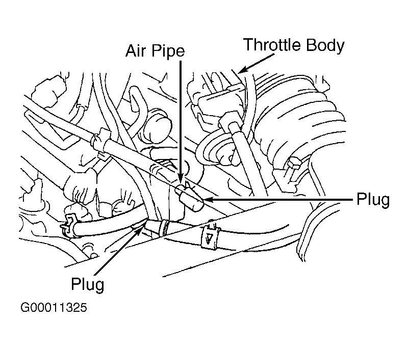 - Remove "V" bank cover located on top of engine (if necessary) and disconnect air assist hose from air pipe. See Fig 1. Air assist hose fits between IAC valve and air pipe. Place plug on end of air pipe and air assist hose. Go to next step.