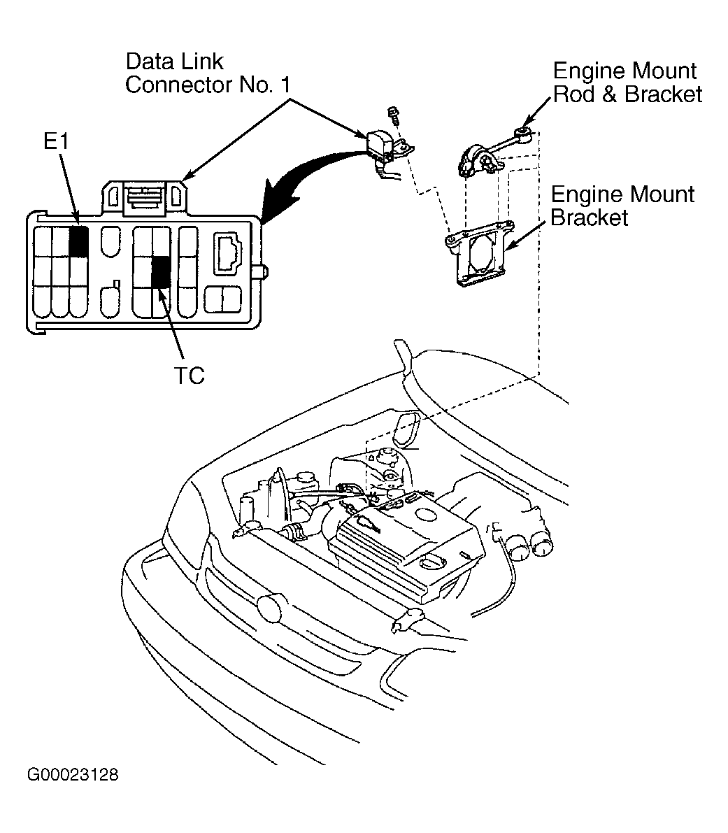 - On Avalon, install Jumper Wire (SST 09843-18020) between terminals TE1 and E1 on data link connector No. 1 located in the engine compartment on end of air intake chamber at passenger's side of engine. See Figure. On Sienna, install Jumper Wire (SST 09843-18020) between terminals TC and E1 on data link connector No. 1 located on engine mount bracket at passenger's side front of engine. See Figure. Go to next step.