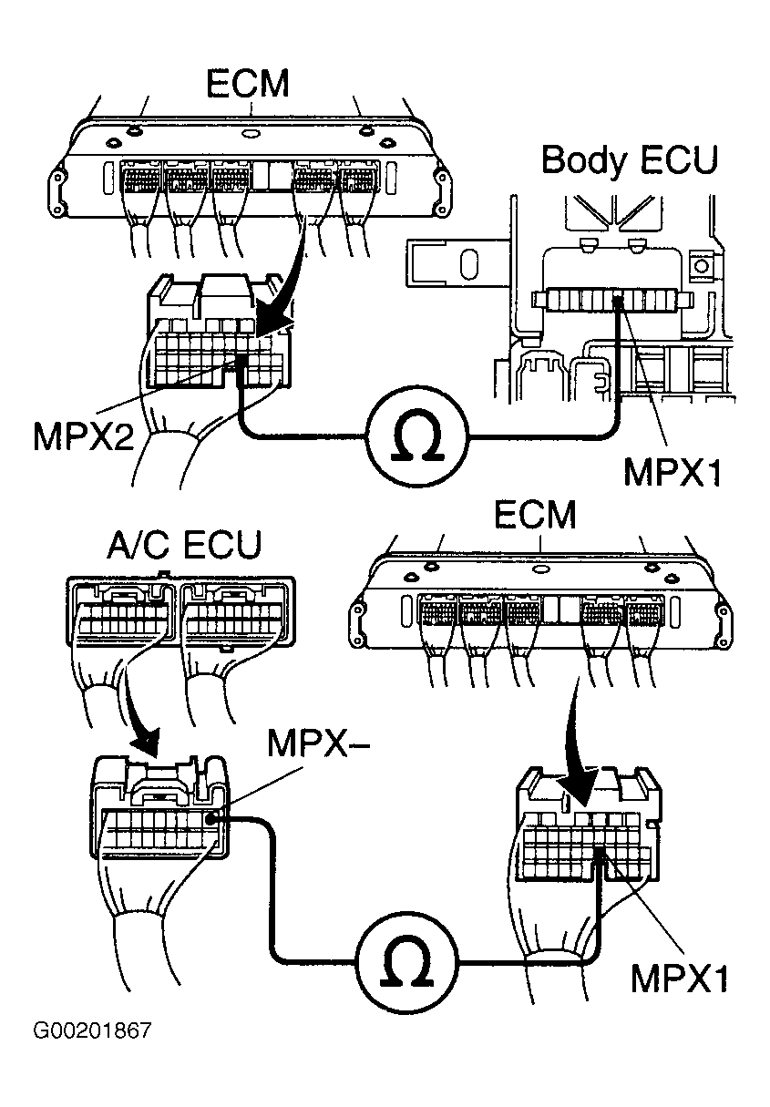 - Check continuity between connector E4 terminal 21 (MPX1) of the ECM and connector A12 terminal 1 (MPX-) of the A/C ECU.
