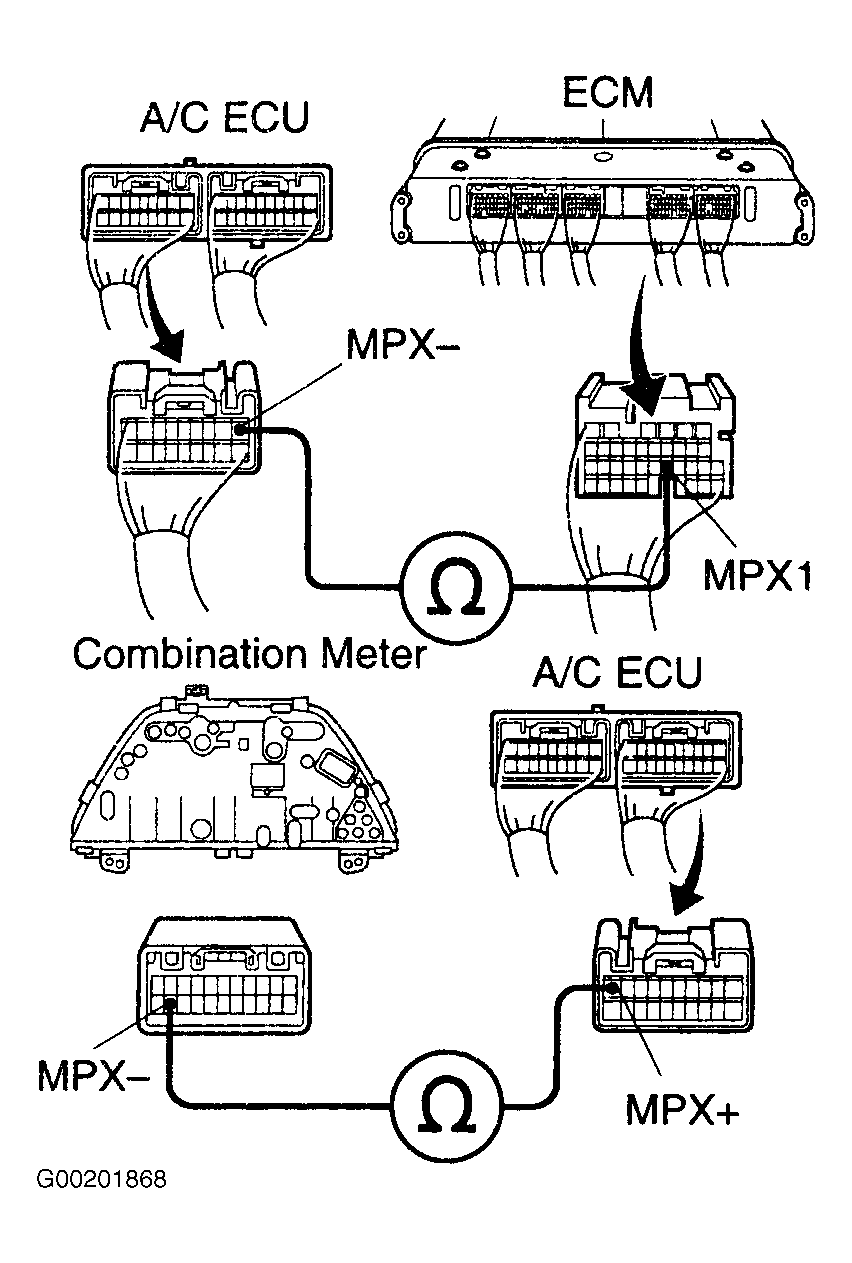 Disconnect connector C9 of the combination meter, connector A12 or A13 of the A/C ECU and connector E4 of the ECM. See Fig 1.