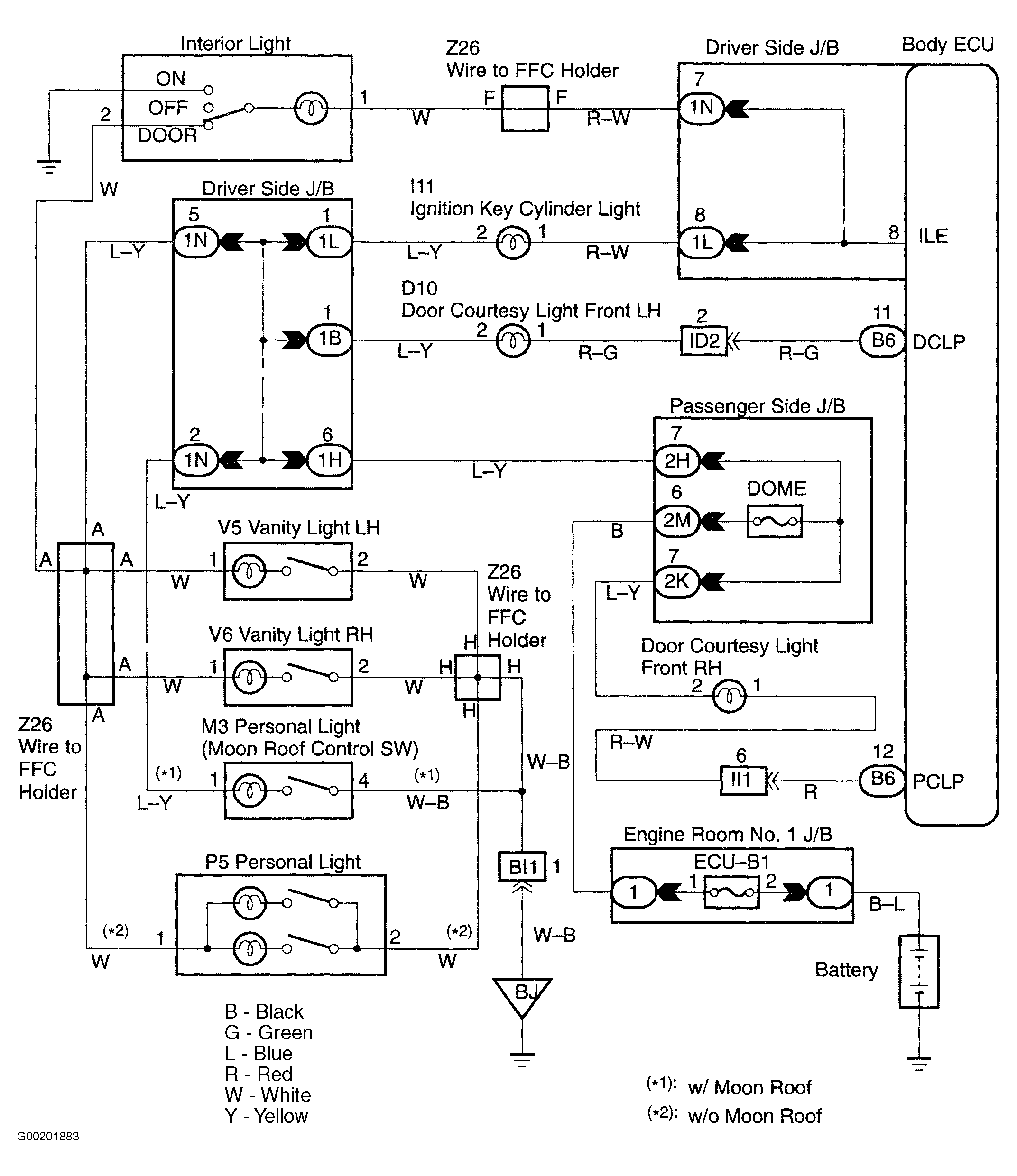 Receiving the courtesy signal from the body ECU will make the interior light, ignition light and courtesy light come on. For circuit diagram, see Fig 1.