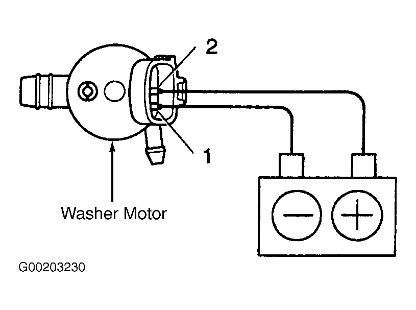 Turn ignition off. Disconnect Black 3-pin electrical harness connector from washer motor. Using fused jumper wires, connect positive battery voltage to washer motor terminal No. 2 and negative battery voltage to washer motor terminal No. 1. See Fig 1. Washer motor should operate. If washer motor does not operate as specified, replace washer motor. See WASHER MOTOR under REMOVAL & INSTALLATION.