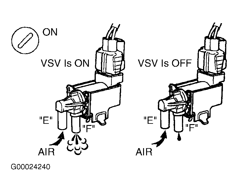 - Connect scan tool to Data Link Connector (DLC) No. 3. See Figure. Ensure ignition is on. Select ACTIVE TEST mode on scan tool. Locate pressure switching valve VSV on charcoal canister. See Figure. Disconnect vacuum hoses from pressure switching valve VSV. Using scan tool, activate pressure switching valve VSV. Apply compressed air to port "E" of pressure switching valve VSV. Air should flow from port "F". See Fig 2. Using scan tool, turn pressure switching valve VSV off. Air should not flow from port "F". If VSV operates correctly, go to step 24. If VSV does not operate correctly, go to next step.