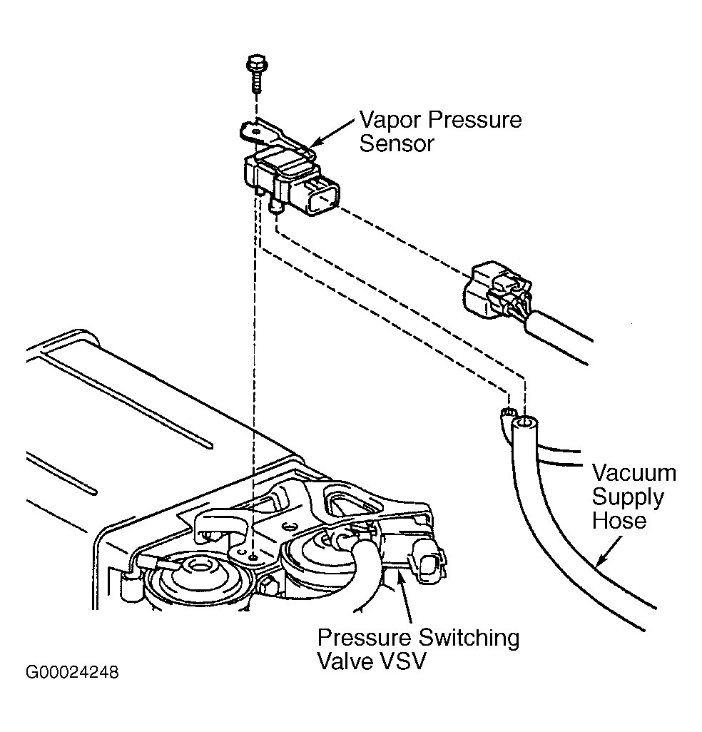 - Check vacuum hoses between vapor pressure sensor and fuel tank, and between pressure switching valve VSV and charcoal canister. Check hoses for correct installation, looseness and damage. Repair as necessary. If vacuum hoses are okay, go to next step.