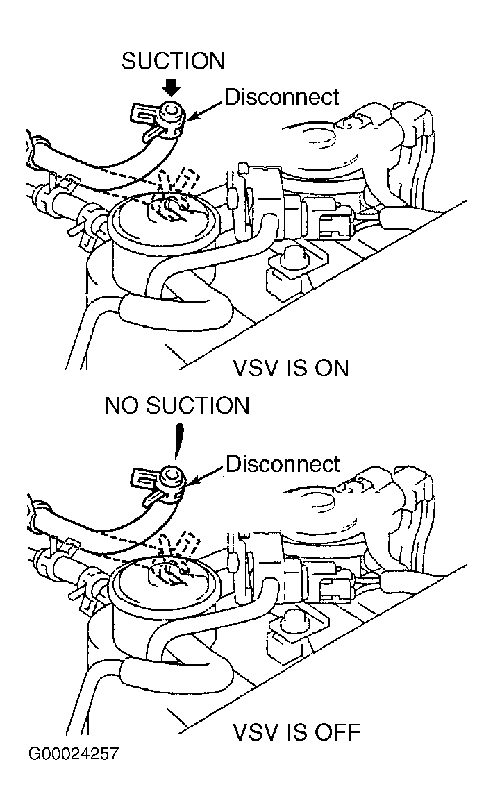 - Check vacuum hose between intake manifold and EVAP VSV, and vacuum hose between EVAP VSV and charcoal canister. If problem exists, replace vacuum hoses as necessary. If problem does not exist, go to next step.