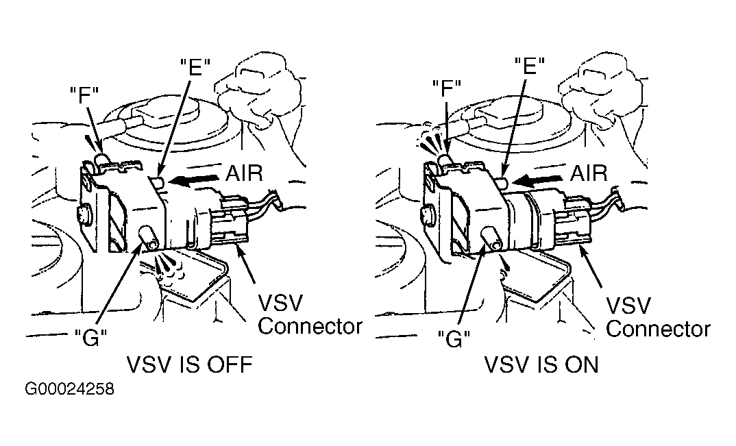 - Turn ignition on. Using scan tool, select ACTIVE TEST mode. Disconnect vacuum hoses from vapor pressure sensor VSV. Apply air pressure to vapor pressure sensor VSV port "E". See Fig 2. When vapor pressure sensor VSV is activated by scan tool, air should flow from port "F". When vapor pressure sensor VSV is not activated, air should flow from port "G". If vapor pressure sensor VSV operates as specified, go to step 13. If vapor pressure sensor VSV does not operate as specified, go to next step.