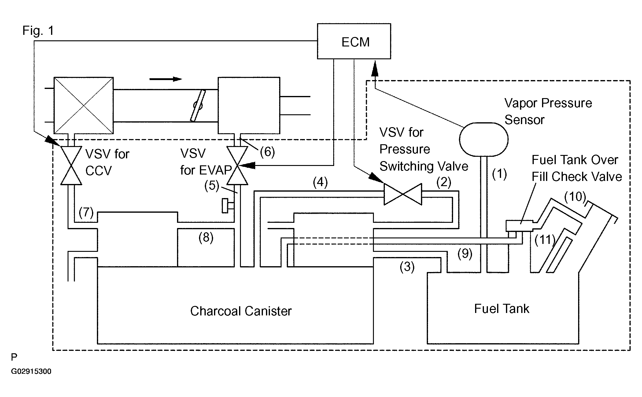 DTC P0442 or P0456 is recorded by the ECM when evaporative emissions leak from the components within the dotted line in Fig 1 below, or when the vapor pressure sensor malfunctions.