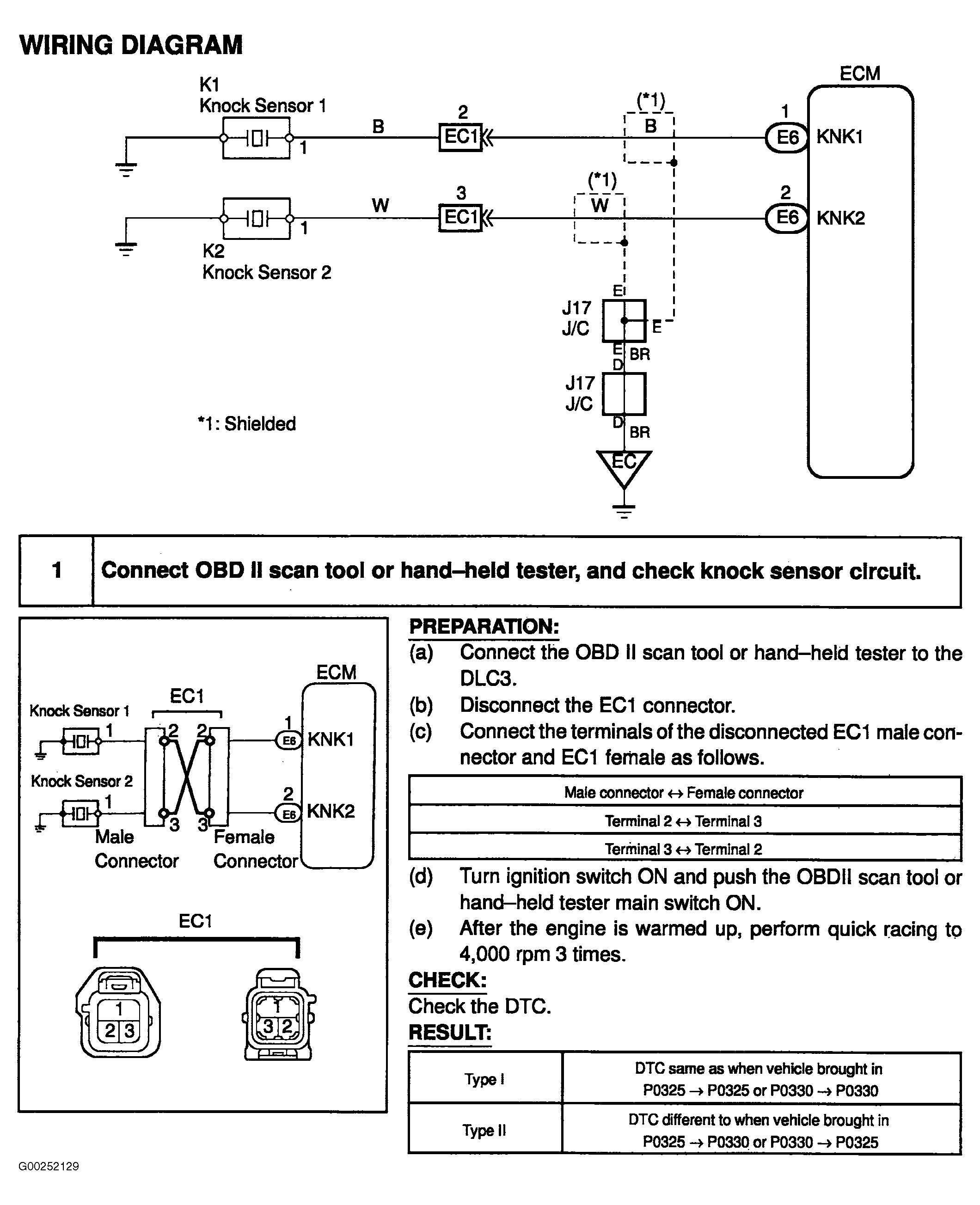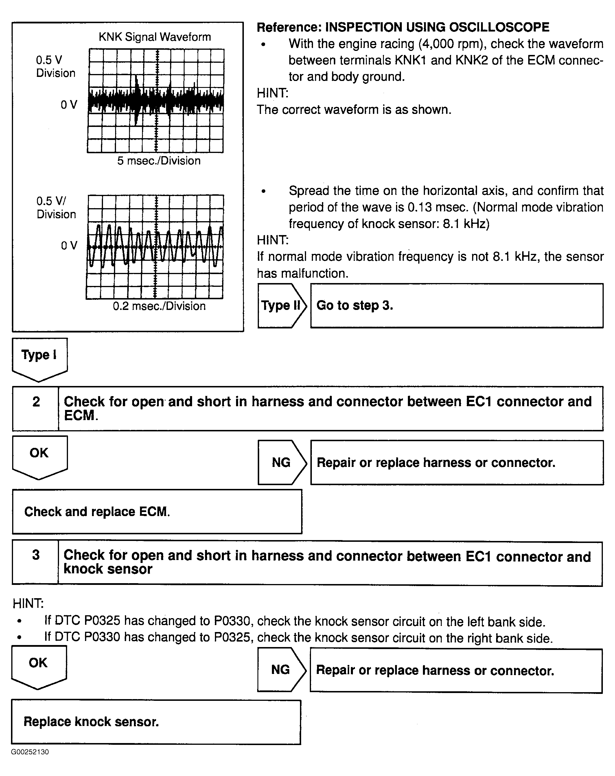 Home >> Toyota >> 2004 >> Matrix Base, FWD, Standard >> Repair and Diagnosis (Single Page) >> External Pages >> Different car >> Section 129 (Engine Control System Self Diagnostics) >> Diagnostic Tests >> DTC P0325: Knock Sensor No. 1 Circuit Or DTC P0330: Knock Sensor No. 2 Circuit >> Diagnosis & Repair