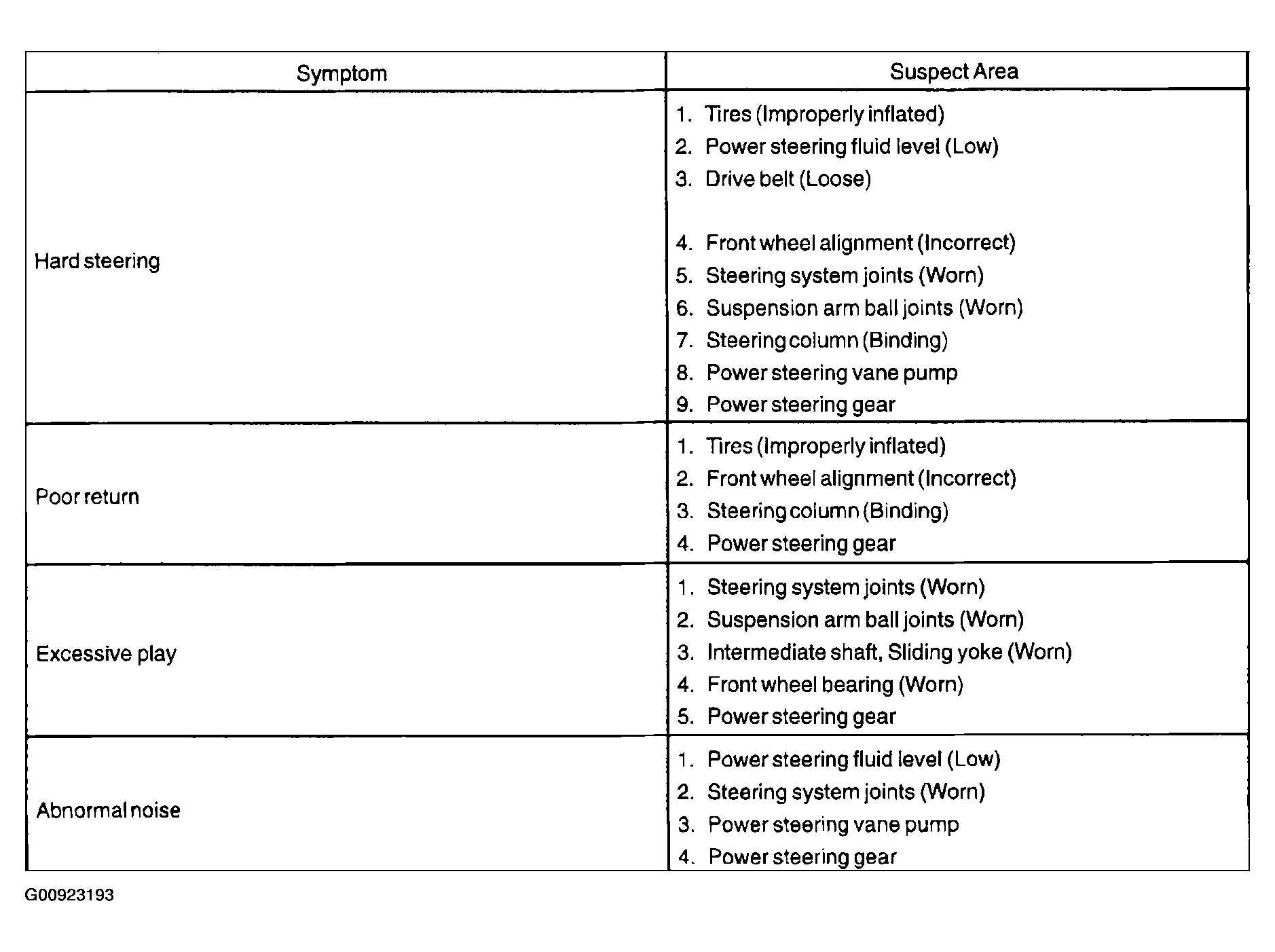 Home >> Toyota >> 2004 >> Matrix Base, FWD, Standard >> Repair and Diagnosis (Single Page) >> Steering >> Steering Gear >> Power Steering >> Power Steering System >> Problem Symptoms Table
