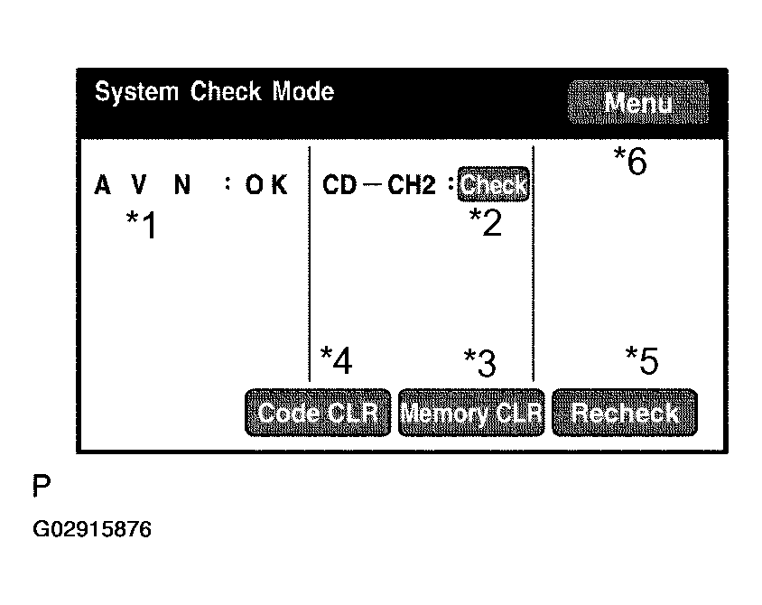 Display Item Function Components Name/*1 (1) List of component names including optional components (15 components max.) are displayed. When the names are not identified, their physical addresses are displayed. Check Result/*2 (1) Check results are displayed. Memory CLR/*3 (1) Pressing this switch for 3 sec. deletes all the information about master component registration. Code CLR/*4 (1) Pressing this switch for 3 sec. deletes diagnosis memory of all the components. It deletes Service Check results and the screen displaying the check results. Recheck/*5 (1) Pressing this switch performs Service Check again. Menu/*6 (1) Pressing this switch activates the Diagnosis Menu screen. (1) For *1-*6, see Fig 5. NOTE:Service Check displays the check results based on the information obtained from each components response to "System Check Execution" and "Diagnosis Memory Request", and the information of "Current DTC Notification". (the Unit Check information that will be displayed on the next screens.)