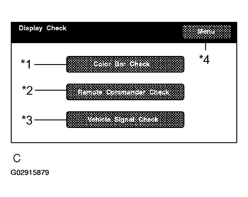 Display Contents Color Bar Check/*1 (1) Color display is checked. Remote Commander Check/*2 Operating condition of touch switch display is checked. Vehicle Signal Check/*3 Status of the vehicle signal which has been loaded into the display is checked. Menu/*4 Pressing this switch activates the Diagnosis Menu screen. (1) For *1-*4, see Fig 8. NOTE:In Display Check, above checks can be performed.