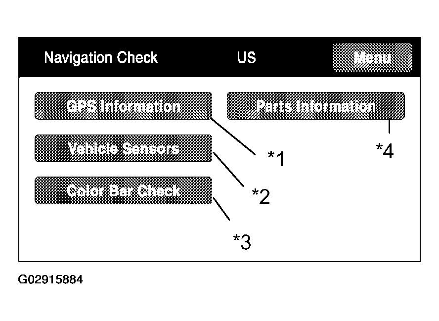 Display Description GPS Information/*1 (1) Information related to GPS is displayed. (updated every 1 second.) Vehicle Sensors/*2 Vehicle signal information to be loaded in the "NAVI" is displayed. (updated every 1 second.) Color Bar Check/*3 Color display of the "NAVI" is checked. (Compare with the Color Bar Check results in the Display Check.) Parts Information/*4 Navigation program version and disc version are displayed. (1) For *1-*4, see Fig 13. NOTE:- In the Navigation Check, the checks mentioned above can be conducted.
