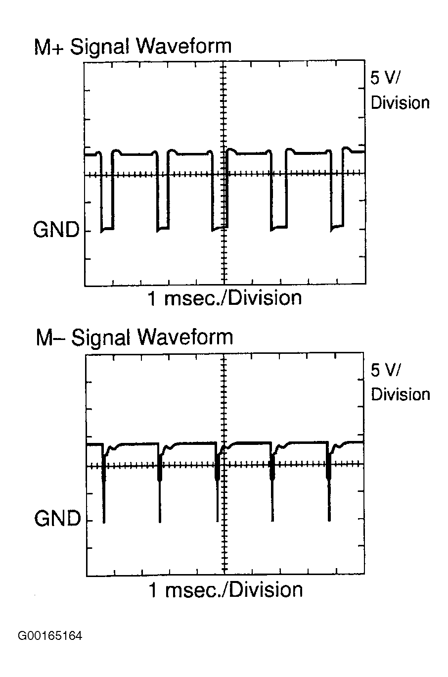 1. Connect the oscilloscope between terminals M+ or M- and E1 of the ECM connectors. Start the engine. Check the waveform between terminals M+ or M- and E1 of the ECM connectors when the engine is idling. The pulse width varies depending on the throttle opening. See Fig 1. If okay, check and replace ECM. If not okay, go to next step.